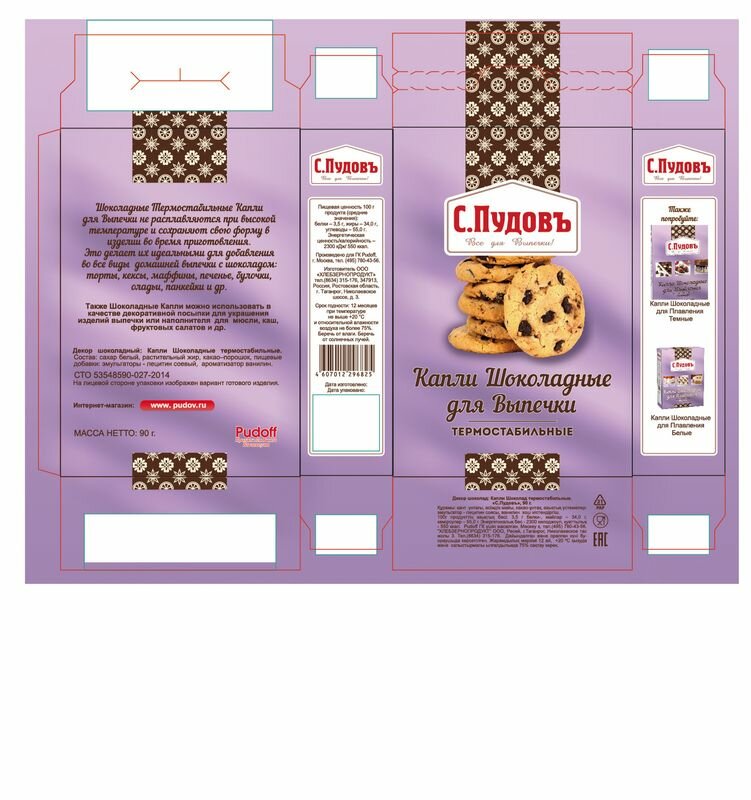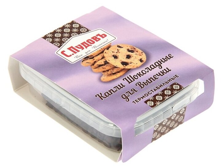 Шоколад – популярное лакомство и любимый ингредиент кондитеров.Однако традиционный шоколад не всегда подходит для выпечки, ведь он легко тает и теряет форму.Мы знаем, как этого не допустить.Используйте термостабильные шоколадные капли для выпечки «С. Пудовъ»!Они не плавятся и сохраняют свою форму при выпечке в духовом шкафу и на сковороде.Шоколадные дропсы красиво выглядит на срезе.Термостабильные шоколадные капли «С. Пудовъ» идеально подходят для добавления в булочки, маффины, печенья, кексы и торты.Ими можно легко украсить готовую выпечку, использовать для декора поверх кондитерской глазури, а также добавлять в каши, мюсли и фруктовые салаты.Шоколадные термостабильные капли (дропсы) оптимального размера, поэтому равномерно распределяются по тесту.Работать с шоколадной начинкой ещё никогда не было так просто - всегда идеальный результат с «С. Пудовъ»!Состав: сахар, заменитель масла какао лауринового типа, какао-порошок, пищевые добавки: эмульгатор Е322, ароматизатор ваниль. Может содержать следы глютена, сои, яиц, молока, орехов, арахиса, кунжута, сельдерея, горчицы.Пищевая ценность 100 г продукта (средние значения): белки – 2,5 г, жиры – 28,0 г, углеводы – 64,0 г.Энергетическая ценность/калорийность: 2180 кДж/520 ккал.Срок годности: 12 месяцев при температуре не выше +20С и относительной влажности не более 75%.Беречь от влаги и попадания солнечных лучей.