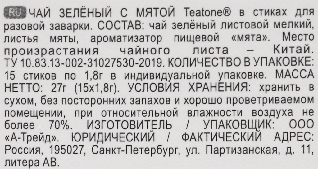 | Состав | чай зеленый байховый мелкий, листья мяты, ароматизатор пищевой мята |