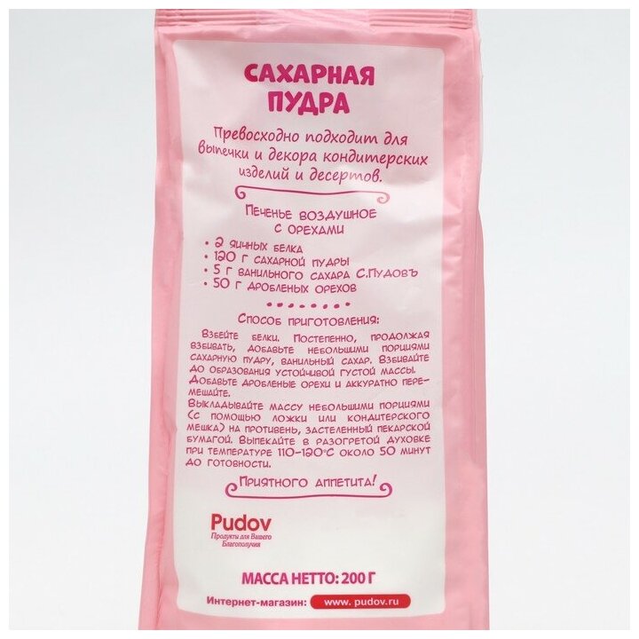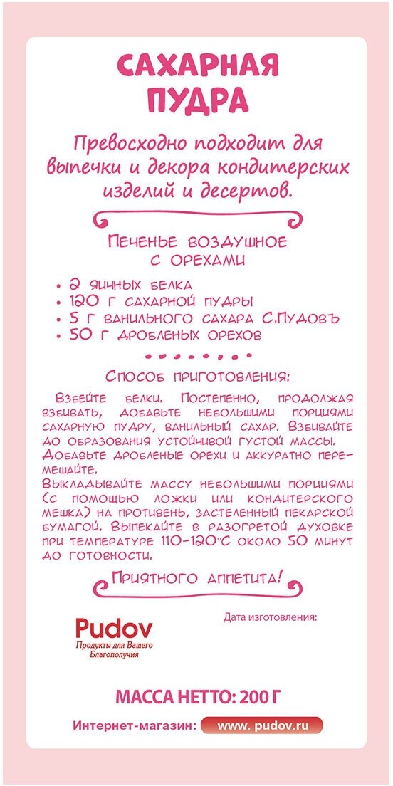 Сахарная пудра «С.Пудовъ» станет универсальным помощником даже самого требовательного кондитера. Она прекрасно подойдет для разнообразной выпечки и создания декора на ней. Незаменимый ингредиент в рецептах нежнейших меренг, безе. Благодаря сахарной пудре тонкого помола ваше тесто для десертов станет однородным и более нежным. Крем будет взбиваться легче, а работа с глазурью станет проще, ведь в ней не будет сахарных комков. Сахарную пудру мелкого помола «С.Пудовъ» можно использовать вместо традиционного сахара при приготовлении прохладительных напитков, коктейлей, компотов и киселей. Результат вам понравится! Наша сахарная пудра не содержит крахмала