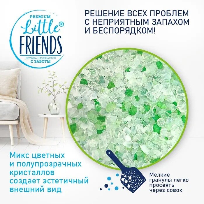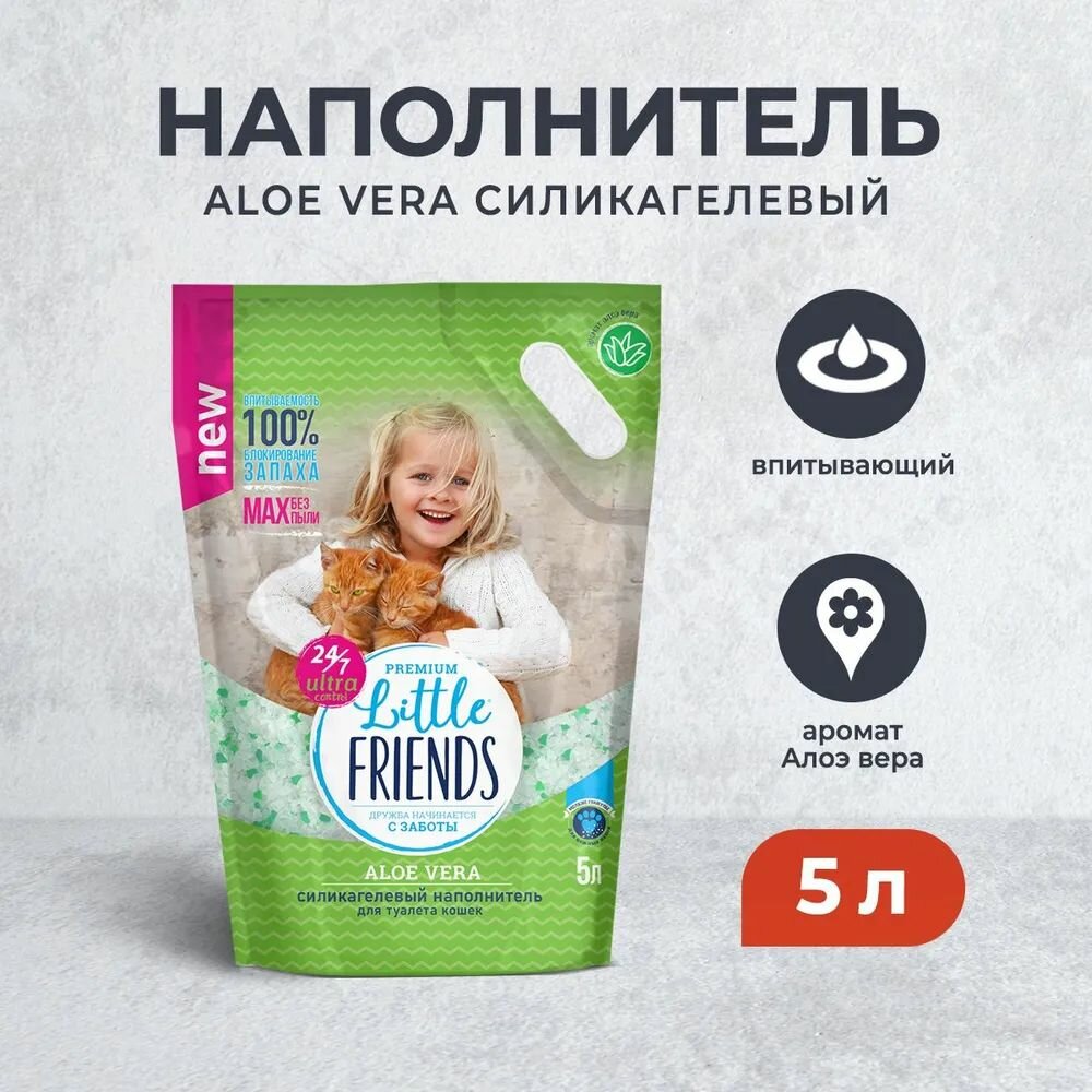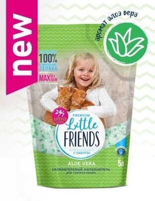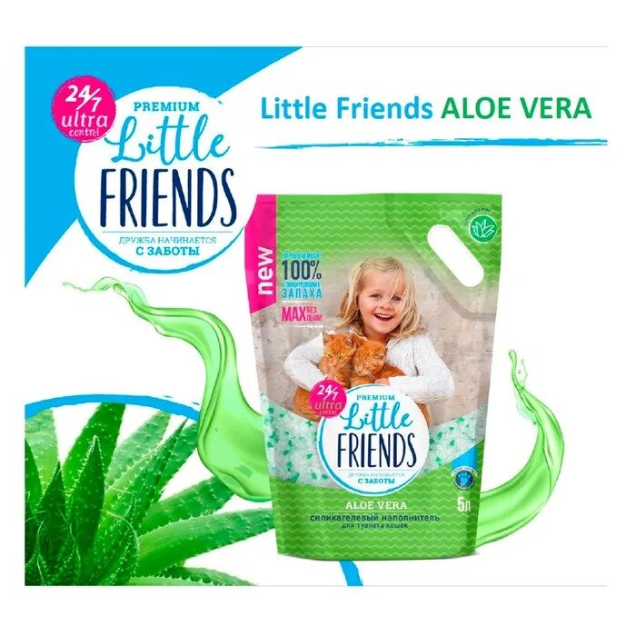 ДРУЖБА НАЧИНАЕТСЯ С ЗАБОТЫ является ведущим принципом Little Friends. Кошки делают нашу жизнь лучше. Они создают уют, поднимают настроение и дарят нам массу позитивных эмоций. Little Friends мы нацелены объединить людей в сообщество любителей кошек, которым близки наши принципы, и вместе делать жизнь кошек лучше. Ведь каждая кошка заслуживает дом, любовь, семью и заботу. Силикагелевый наполнитель премиального качества с легким, нежным аромат алоэ вера подарит ощущение комфорта и свежести. Новая формула Ultra Control работает 24 саса в сутки - поглощает и удерживает все неприятные запахи. Аромат активно проявляется только после попадания жидкости, ароматизируя воздух вокруг лотка и не мешает Вашему питомцу. * Little Friends моментально впитывает влагу, лапки всегда остаются сухими и чистыми. * 24 часа в сутки поглощает и удерживает все неприятные запахи. * Микс цветных и полупрозрачных гранул создает дополнительный эффект чистоты и свежести в лотке. * Формула максимально без пыли. * С маленькими гранулами Little Friends чистка лотка станет более легкой и быстрой. Наполнитель легко раскапывать и легко просеивать через совок. Вы по достоинству оцените экономию времени и легкость уборки. * Маленькие гранулы Little Friends не ранят и не колют нежные лапки кошки. Не доставят дискомфорта владельцу, если случайно наступить на них.