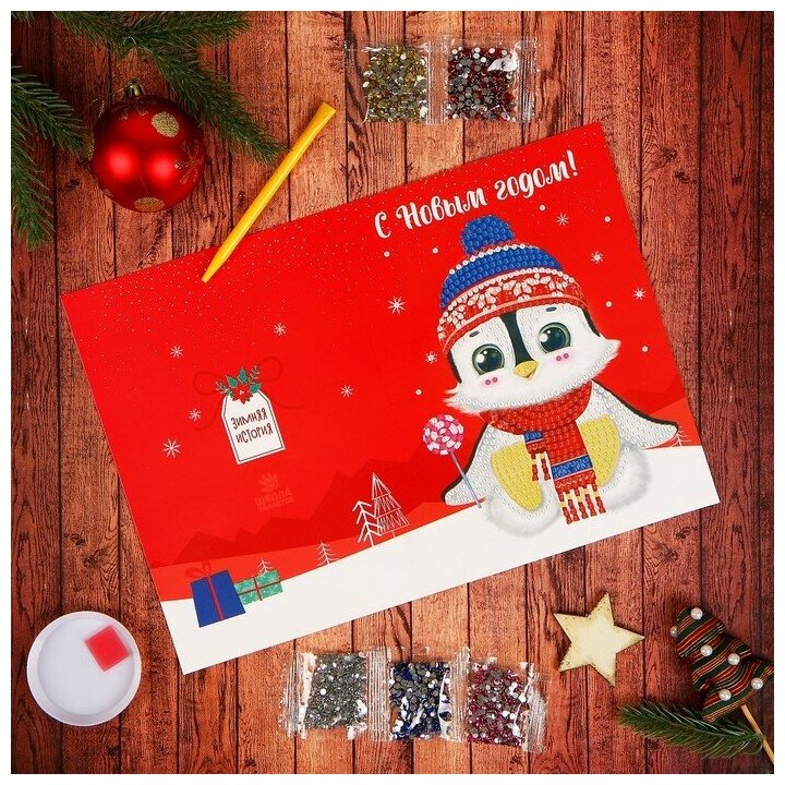 4181540 Алмазная вышивка на открытке "Зимняя история" + емкость стержень с клеевой подушечкой Школа талантов (размер: 15х21 см)