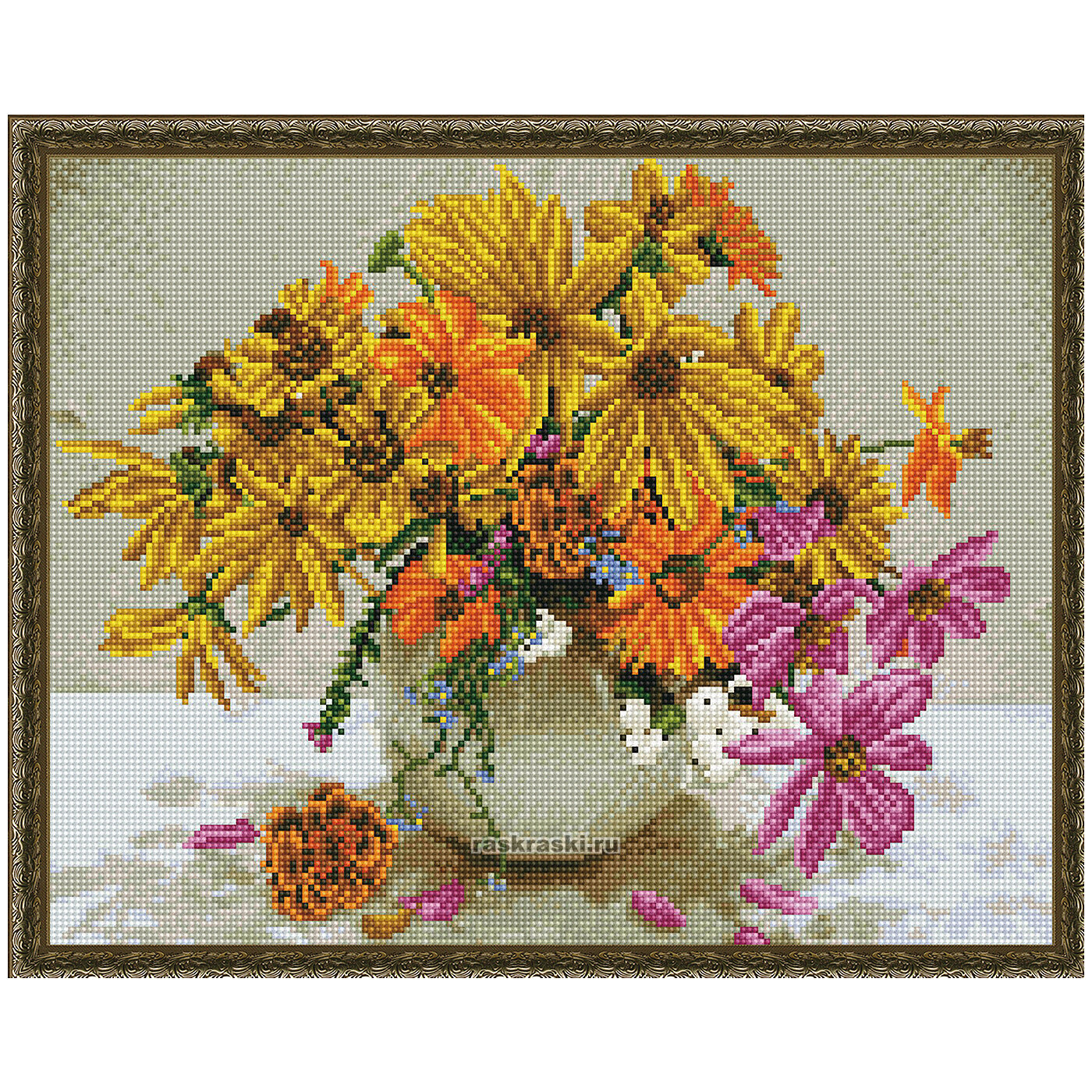 Картина мозаикой с нанесенной рамкой 40х50 Краски лета (36 цветов) Алмазная мозаика - наборы, в которых желаемое изображение выкладывается на основе со схемой рисунка при помощи специальных декоративных элементов. Подсказка в виде нанесенного контура существенно облегчает задачу и дает возможность создавать картину даже людям, не имеющим художественных навыков. Готовая картина переливается на свету всеми цветами радуги. К тому же, принцип рисования по номерам, заложенный в основу создания алмазной мозаики, делает такое творчество доступным каждому и исключает неудачи.С помощью мозаичных элементов на холсте можно выложить картину с изображением букета розовых, желтых и оранжевых цветов в белой вазе. Размер: 40х50 см Форма элементов: круглая Уровень сложности: 5 высокий Количество цветов: 36 В комплекте: Тканевый холст тканевый холст с клеевым слоем и с нанесенной схемой рисунка Схема с символами мозаики Пинцет металлический Стилус для захвата элементов Клей-липучка для стилуса Пластиковый контейнер для элементов мозаики Комплект разноцветных мозаичных элементов диаметром 2,5 мм Фурнитура для крепления картины