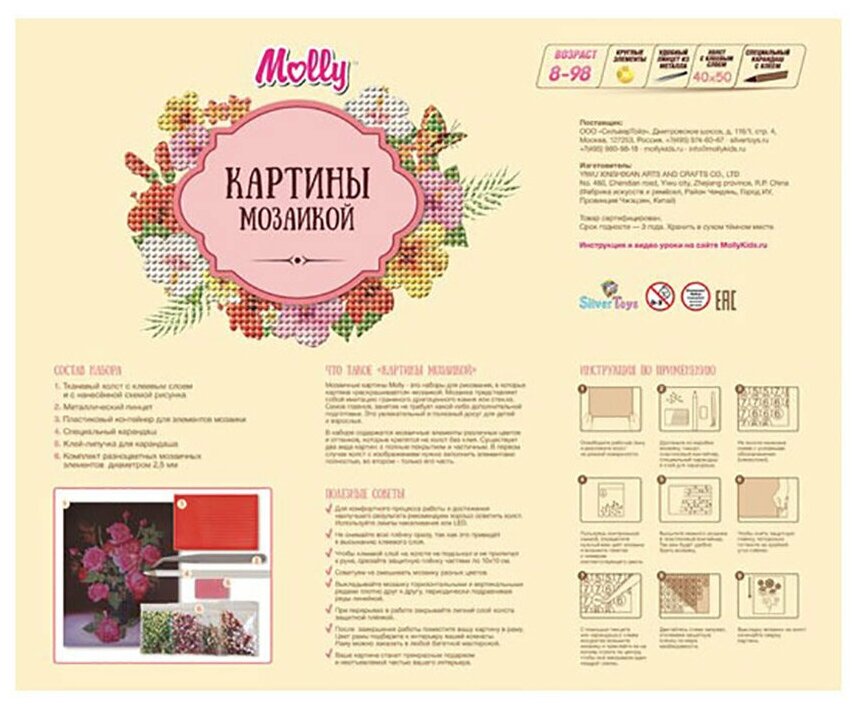 | В набор входит | Холст с клеевым слоем и с нанесенной схемой рисунка, набор акриловых камней-страз, кол-во цветов страз: 36, металлический пинцет, лоток для страз, специальный карандаш-стилус, клей-липучка для карандаша-стилуса, крепеж для подвешивания картины |
