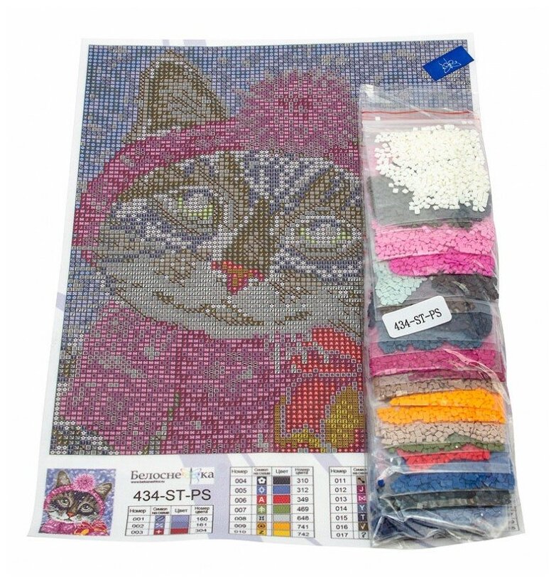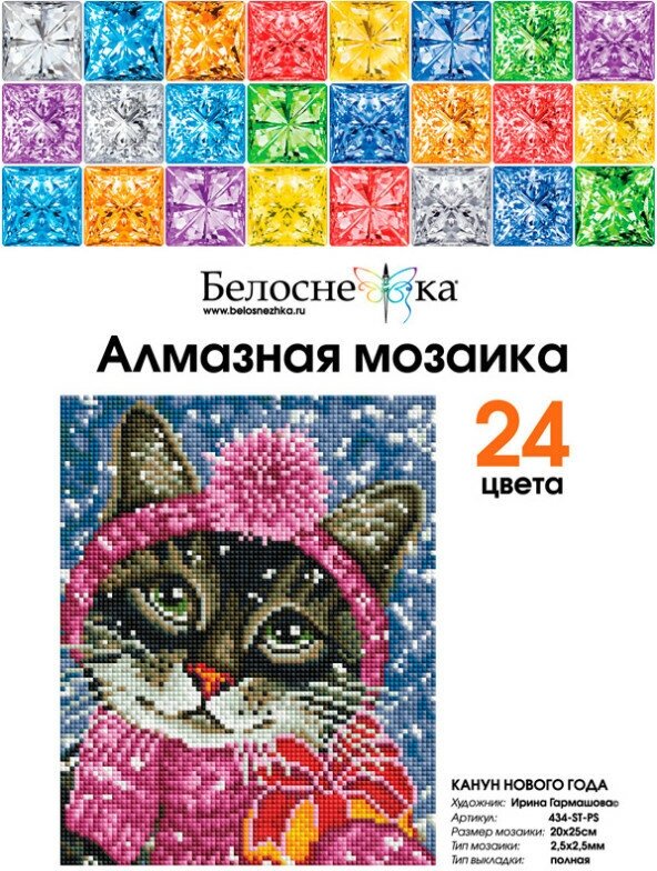 В набор входит | холст с нанесенной схемой и клеевым покрытием, комплект квадратных камней с огранкой 2.5х2.5 мм., 9 и 13 граней, пластмассовый лоток с ячейками, пинцет металлический, дополнительный тюбик клея, листовка-ключ к схеме |