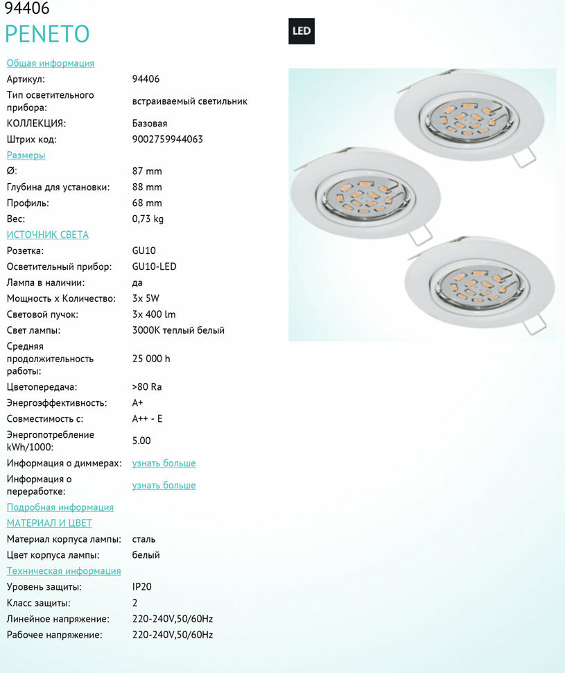 | Дополнительные характеристики | в комплекте 3 светильника |