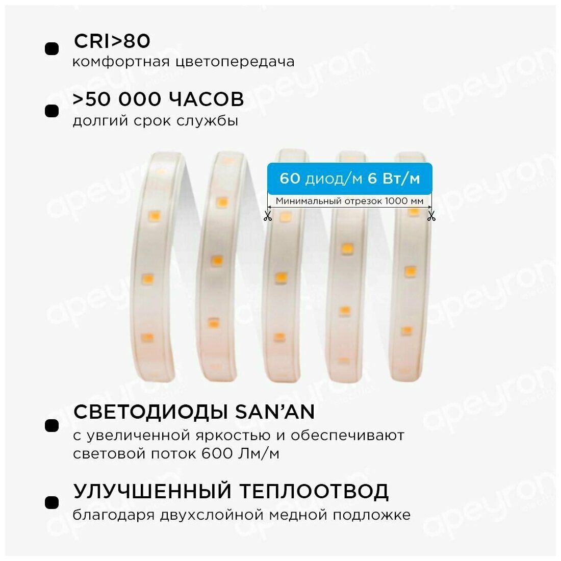 Комплект светодиодной ленты Apeyron предназначен для размещения в офисах, магазинах, для внутреннего и наружного освещения, подсветки витрин, рекламы и т.д. Наружный шнур ленты изготовлен из высококачественного ПВХ с высокой светопропускной способностью. Гибкая подложка оснащена медными проводами, которые надёжнее и безопаснее алюминиевых.