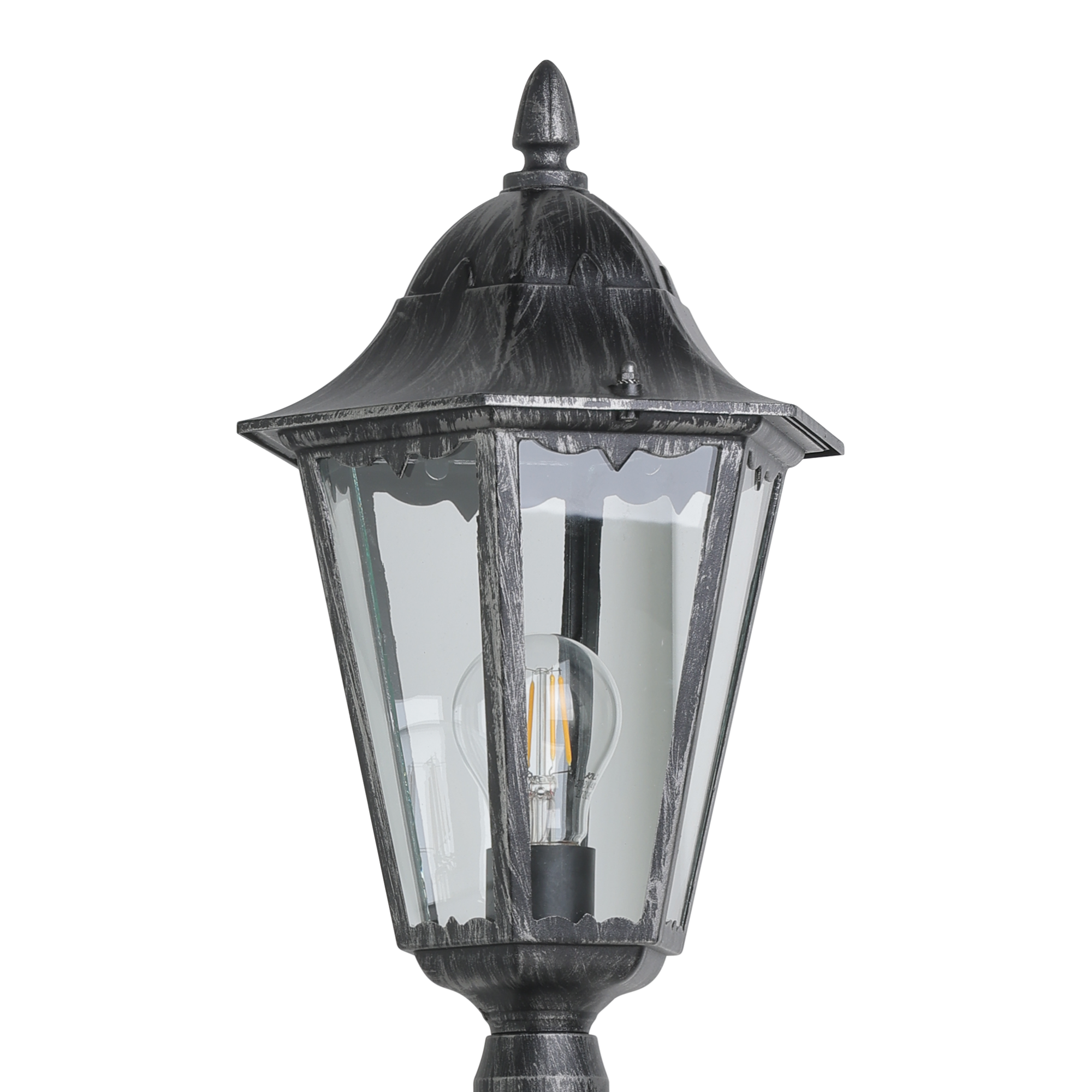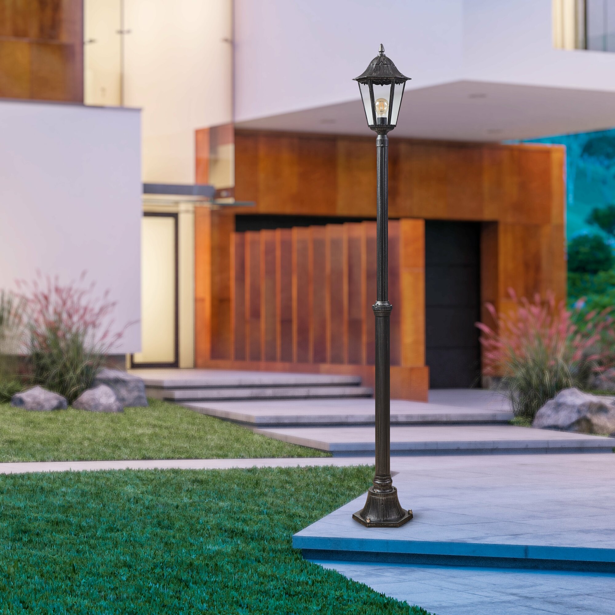 Уличный фонарь NAVEDO - идеальный элемент освещения благоустройства территории загородного дома в классическом стиле. Светильник выполнен в классическом стиле. Основание черного цвета с эффектом старины выполнено из литого алюминия и увенчано стеклянным плафоном. Прозрачное стекло, которое используется для плафона, надежно защищает источник от пыли и влаги, но при этом оставляет его визуально открытым. Светильник рассчитан на один источник освещения мощностью 60W(E27), для поддержания стилистики рекомендовано использовать лампу в ретро-стиле. Благодаря классу влагозащиты IP44 светильник можно безопасно использовать для создания освещения для улицы, сада или террасы.