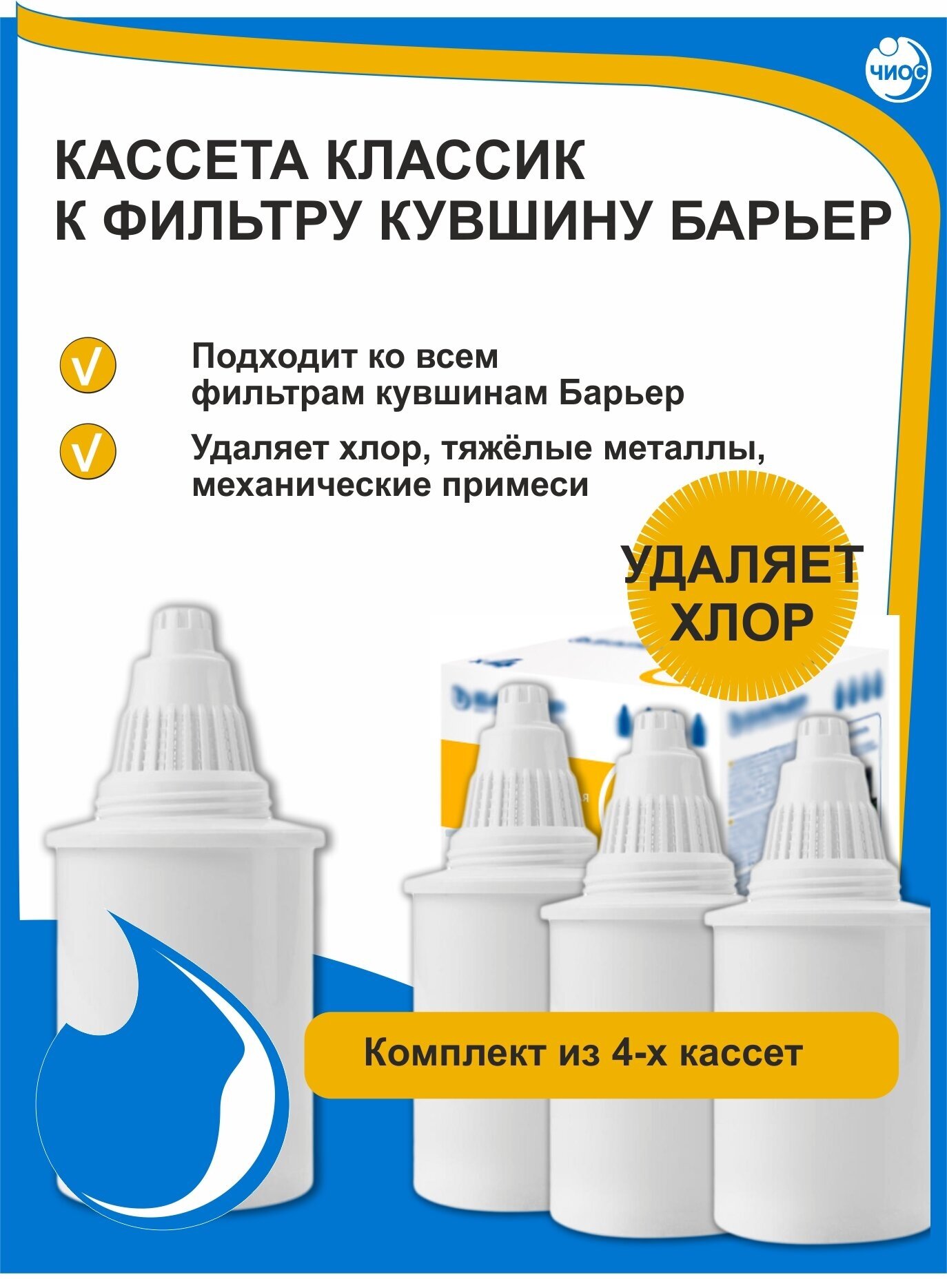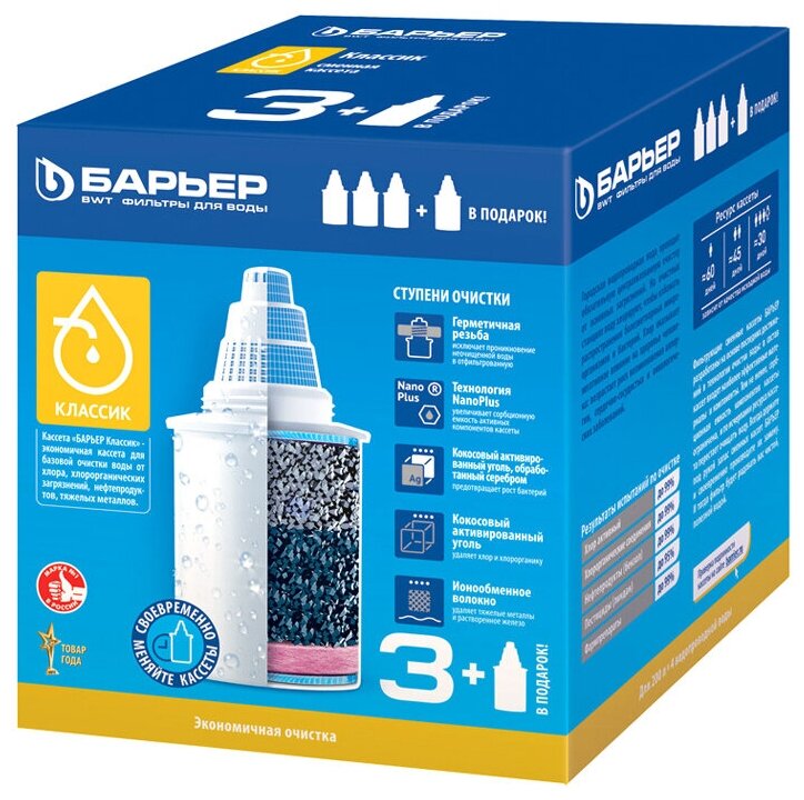 Кассеты «Классик» к фильтрам-кувшинам для воды являются экономичным и эффективным средством очистки от различного типа примесей: побочных продуктов хлорирования, механических примесей, а также неприятных запахов и привкусов. Комплект включает 3 кассеты, каждая имеет производительность 200 литров.