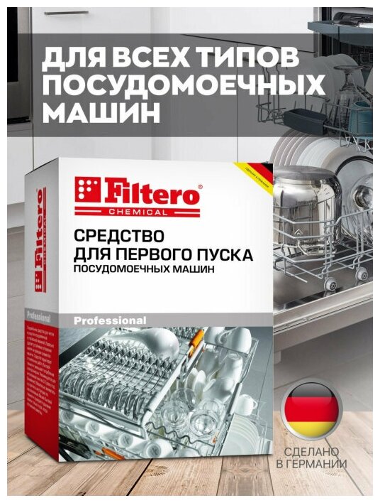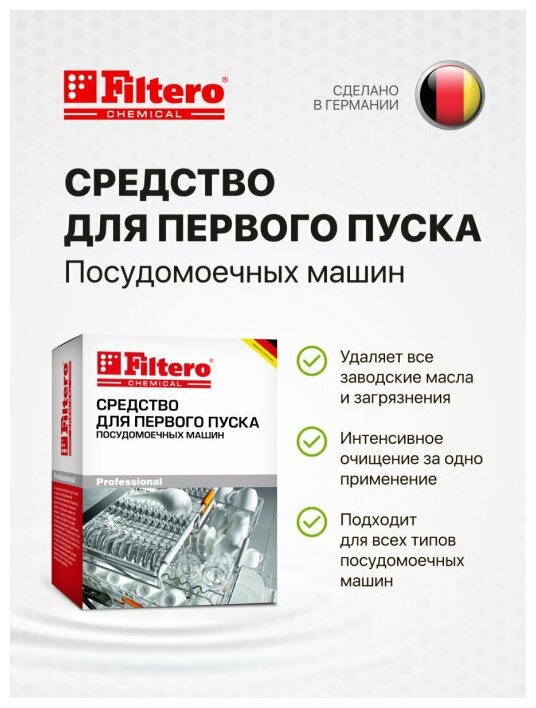 Средство Filtero для первого пуска посудомоечной машины - Удаляет все заводские масла и загрязнения - Интенсивное очищение за одно применение - Подходит для всех типов посудомоечных машин Уникальное средство для первого пуска посудомоечной машины. Специальные компоненты в основе новой формулы средства тщательно растворяют все заводские масла, естественно присутствующие на деталях новой машины, смывают пыль и различные загрязнения с внутренней поверхности и других частей посудомоечной машины, соприкасающихся с водой и посудой.