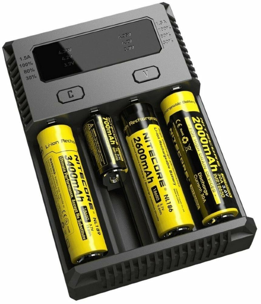 Если Вам нужно одновременно зарядить 2 разных типа аккумуляторов (например, 18650 и 16340), вовсе необязательно использовать под каждый элемент питания определенное зарядное устройство (ЗУ). Ведь гораздо проще установить эти аккумуляторы в одно универсальное ЗУ, способное одновременно заряжать разнотипные аккумуляторы - Nitecore . имеет 4 независимых друг от друга канала питания, с помощью которых Вы сможете заряжать одновременно до 4-х аккумуляторов. Благодаря встроенному микропроцессору, зарядное устройство автоматически определит тип установленного элемента питания и будет подавать на него необходимое напряжение до тех пор, пока аккумулятор не зарядится до 100%. Затем зарядка автоматически прекратится. Встроенный LED-дисплей поможет Вам следить за прогрессом зарядки, также на нём будут отображаться соответствующие уведомления об окончании зарядки или ошибке (в случае неправильной установки аккумулятора или установки неперезаряжаемого элемента питания). Особенности: 4 полностью независимых друг от друга слота зарядки;Максимальная сила тока, подаваемая одновременно на один слот – 1500 мА / на два слота – 750/500 мА / на четыре слота – 375 мА;Интегрированный микропроцессор автоматически определяет тип установленных элементов питания, их емкость и подаст наиболее подходящее напряжение;Nitecore подходит для зарядки аккумуляторов следующих типов: Ni-CD и Ni-MH, Li-Ion, IMR и LiFePO4;Nitecore может использоваться для восстановления полностью севших IMR-аккумуляторов;Встроенная защита от перезаряда автоматически прекратит подачу тока на полностью заряженные элементы питания;На интегрированном LED-дисплее отображается актуальная информация касательно текущего уровня заряда аккумулятора и различные уведомления;Защита от обратной полярности не позволяет давать ток на неправильно установленные элементы питания (на дисплее загорится соответствующий индикатор); может работать от сети 220 или 12 В (например, от автомобильного прикуривателя);Корпус из огнеупорных ABS материалов.Характеристики: вход: AC 100 ~ 240V 50 / 60Hz 0.25A (макс.) 10 ВтDC 9 ~ 12V 1A;вывод: 4.35V ± 1% / 4.2V ± 1% / 3,7 ± 1% / 1.48V ± 1%1.5A × 1 / 0.75A × 2 / 0.5A × 2 / 0.375A × 4.Совместимость с аккумуляторами: Li-Ion / IMR / LiFePO4:10340, 10350, 10440, 10500, 12340, 12500, 12650, 13450,13500, 13650, 14350, 14430, 14500, 14650, 16500, 16340 (RCR123),16650, 17350, 17500, 17650, 17670, 18350, 18490, 18500,18650,18700, 20700, 21700, 22500, 22650, 25500, 26500, 26650. Ni-MH(NiCd): AA, AAA, AAAA, C, D.