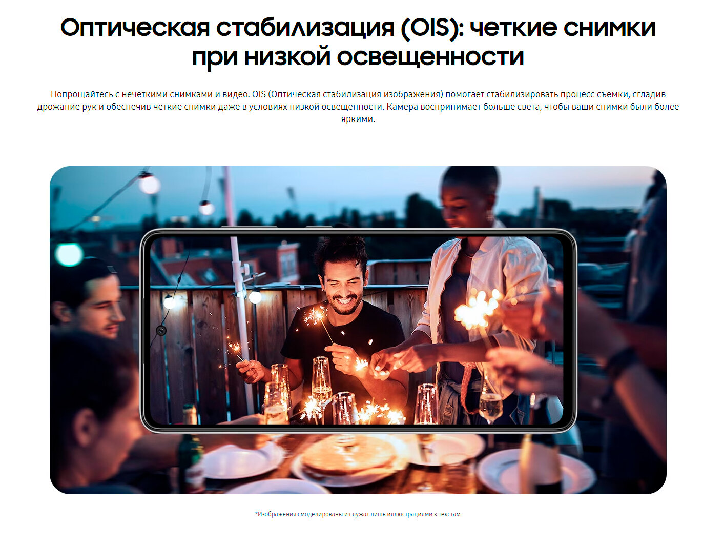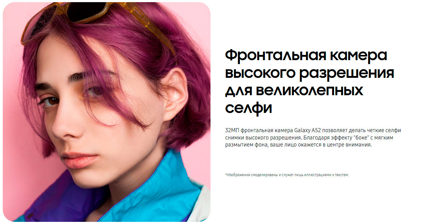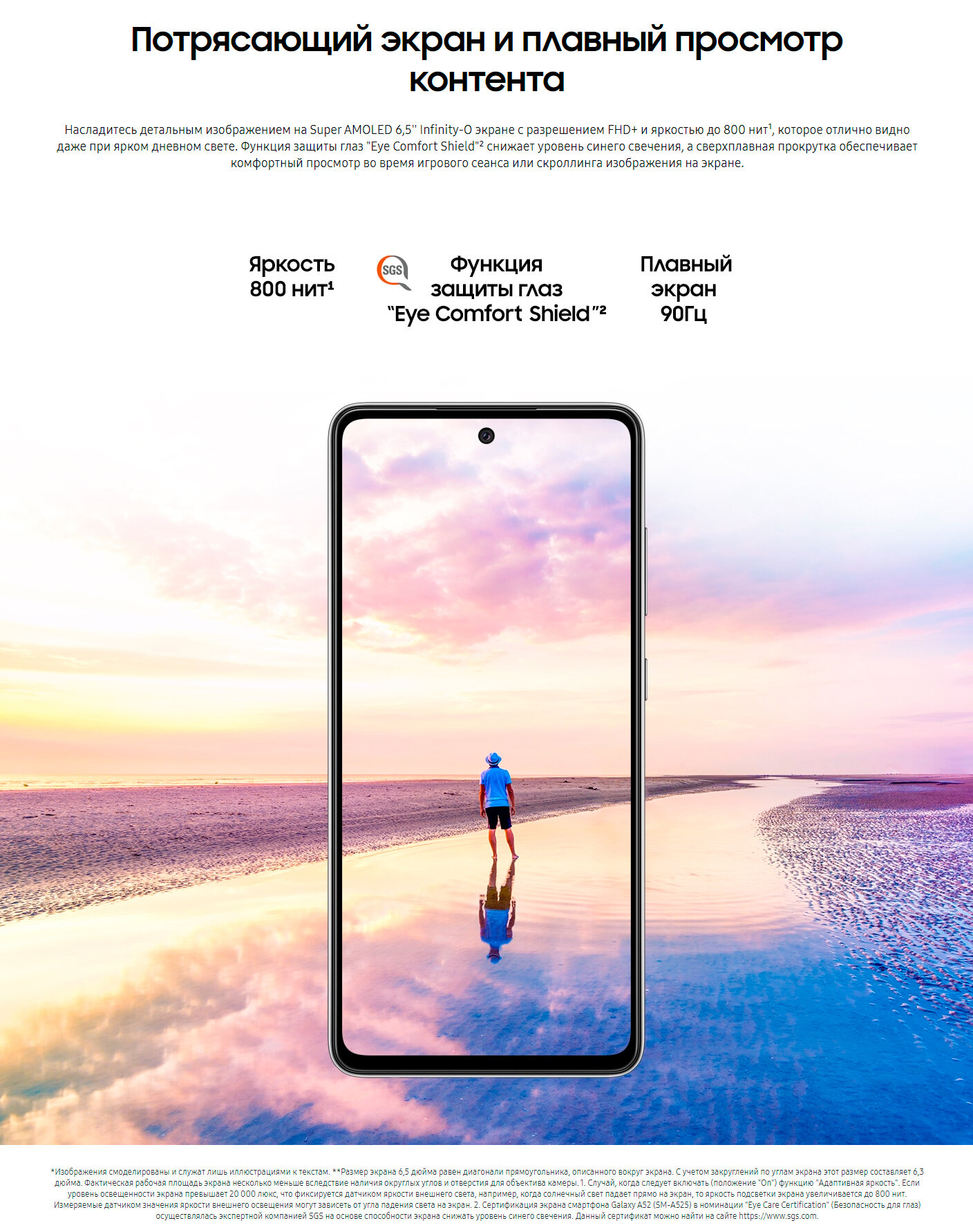 Насладитесь детальным изображением на Super AMOLED 6, 5 Infinity-O экране с разрешением FHD+ и яркостью до 800 нит, которое отлично видно даже при ярком дневном свете. Функция защиты глаз Eye Comfort Shield снижает уровень синего свечения, а сверхплавная прокрутка обеспечивает комфортный просмотр во время игрового сеанса или скроллинга изображения на экране. Четыре AI камеры Galaxy A52 поднимают уровень качества фото на новую высоту. Делайте сверхчёткие снимки на 64 мегапиксельную основную камеру с оптической стабилизацией. Расширьте поле зрения камеры с помощью сверхширокоугольной камеры. Управляйте резкостью камеры с датчиком глубины или снимите детали объекта съемки с помощью Макро камеры. Попрощайтесь с нечеткими снимками и видео. OIS (Оптическая стабилизация изображения) помогает стабилизировать процесс съемки, сгладив дрожание рук и обеспечив четкие снимки даже в условиях низкой освещенности. Камера воспринимает больше света, чтобы ваши снимки были более яркими.