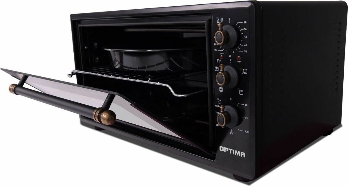 Электрическая духовка OPTIMA отличается высоким качеством исполнения и стильным внешним видом выдержанном в форме прямоугольника. Чёрный цвет духовки подойдет для стильных кухонь и хозяек любящих яркие цвета. Переключатели плиты выполнены в стиле «РУСТИК». Духовка выглядит дорого и стильно.