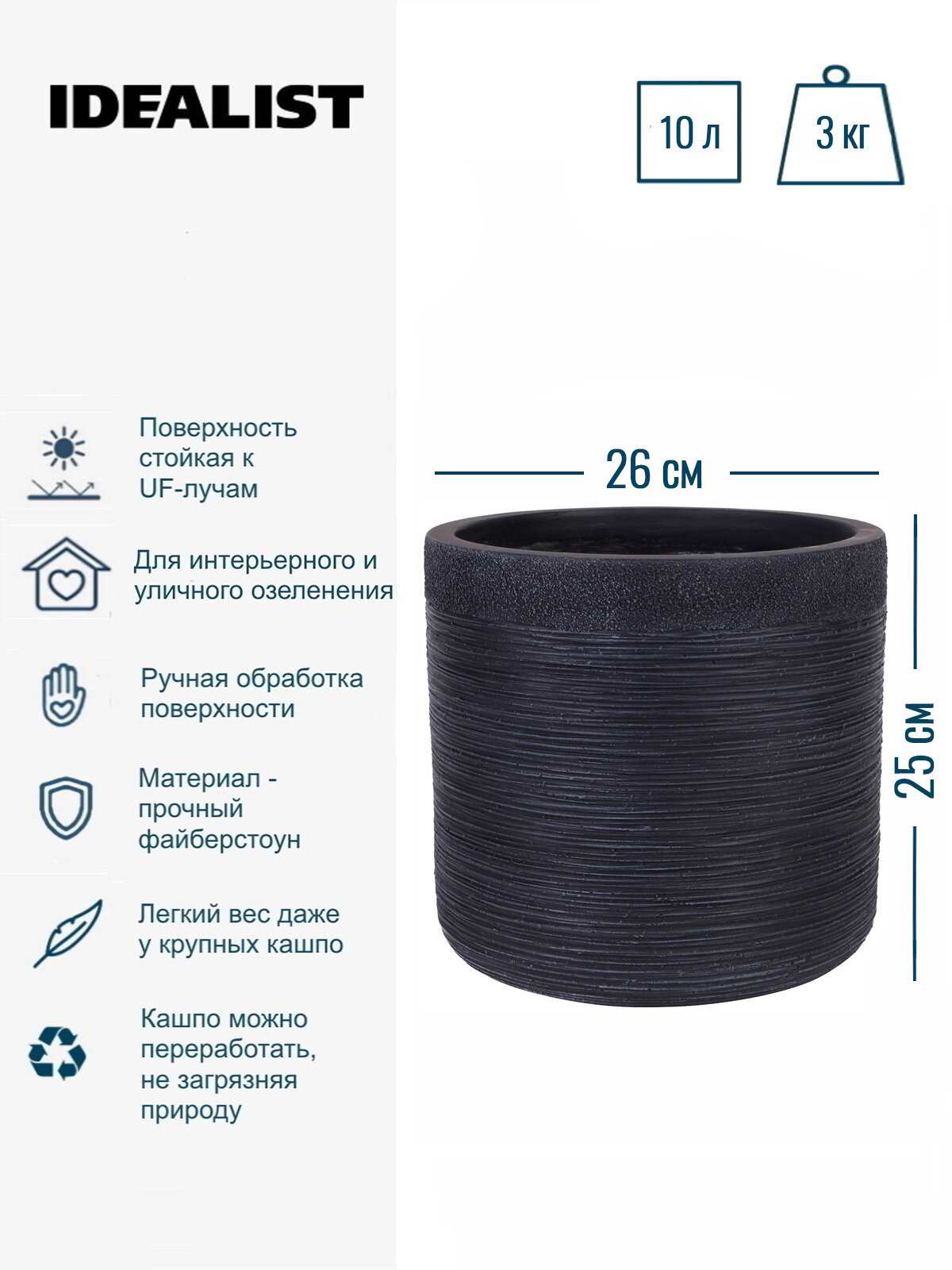 Инновационный материал файберстоун. Матовая текстура в сочетании с эффектной фактурой. Легкий вес. Изготовлено вручную. Для интерьерного озеленения. Особенности цветочного горшка Флоранжери Круглый Цветочный горшок цилиндрической формы изготовлен из файберстоуна. Цвет: кремовый. Поверхность оформлена сочетанием двух оригинальных текстур. Параметры изделия: высота 49 см, диаметр 50 см. В горшке есть метки для сверления дренажного отверстия. Цветочный горшок Флоранжери Круглый подходит для комнатного и уличного озеленения. Стильно и с акцентом на главном Просто и одновременно стильно — это «Флоранжери»! Коллекция со сдержанными формами и элегантным дизайном. Такие горшки достойно покажут себя в любом помещении. Благодаря большой линейке размеров коллекция совместима с большими и маленькими, цветущими и декоративно-лиственными растениями. Для каких растений подходят горшки? Цветочные горшки подходят для всех комнатных растений, произрастающих в грунте, а также для уличных растений. Нужны ли внутренние вставки в эти горшки? Внутренние вставки не нужны. Можно насыпать больше керамзита на дно горшка, чтобы образовался дренажный слой. Высокая прочность и современный вид В основе – инновационный качественный материал файберстоун. Благодаря этому прочному композитному материалу горшки сохраняют свои характеристики, благородный внешний вид и аутентичность на долгое время. На вершине дизайна Матовые поверхности, приятные фактуры и природные цвета идеально передают текстуру камня и впечатляют, увлекают, завораживают! Горшки IDEALIST LITE сделаны вручную. Поверхность может иметь следы ручной обработки в виде легких сколов или потертостей. Это придает горшкам естественность и свидетельствует о творческом процессе производства. С помощью рук гончаров рождаются настоящие шедевры! Удобство перемещения Не удивляйтесь, солидный внешний вид и высокое качество исполнения IDEALIST LITE не превращают их в громоздких тяжеловесов. Благодаря использованию современного материала файберстоун даже самые крупные горшки остаются вполне мобильными. Защита природы - материал может быть переработан Используя горшки IDEALIST, вы заботитесь о нашем наследии, ведь горшки можно переработать и не загрязнять природу!