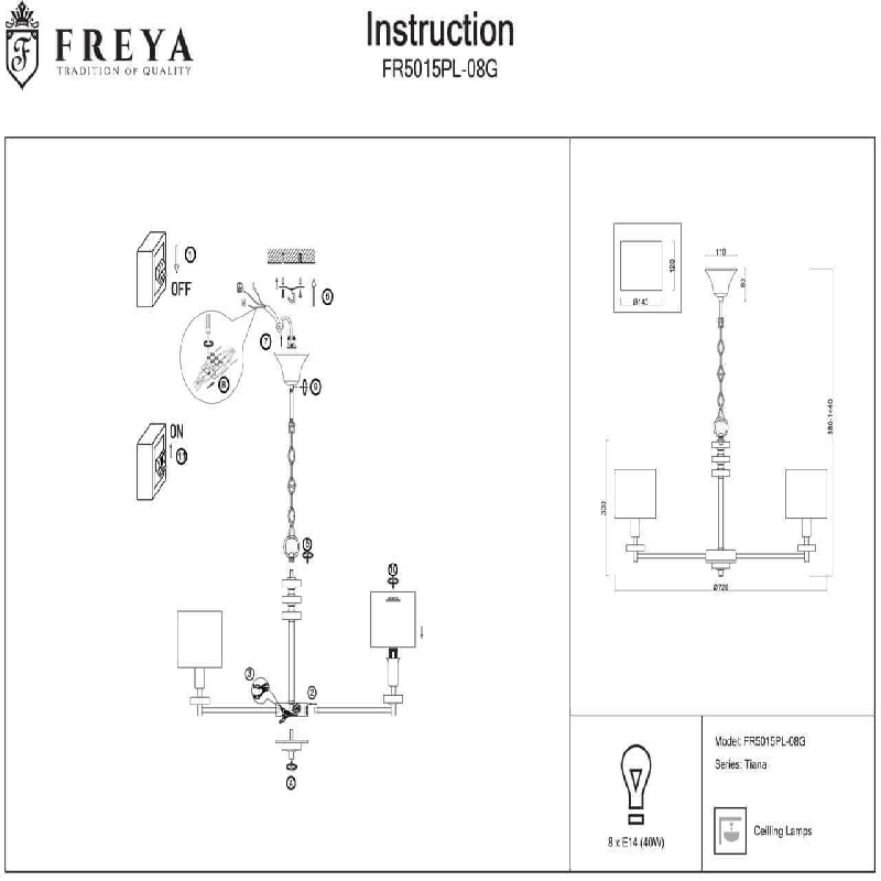 Подвесная люстра Tiana FR5015PL-08G - продукт известной компании Freya (Германия). Имеет максимальную мощность 320 Вт, освещает площадь до 16 кв. м. Отлично подойдет для таких мест, как гостиная, спальня, кухня. Впишется в интерьеры следующих стилей: модерн.