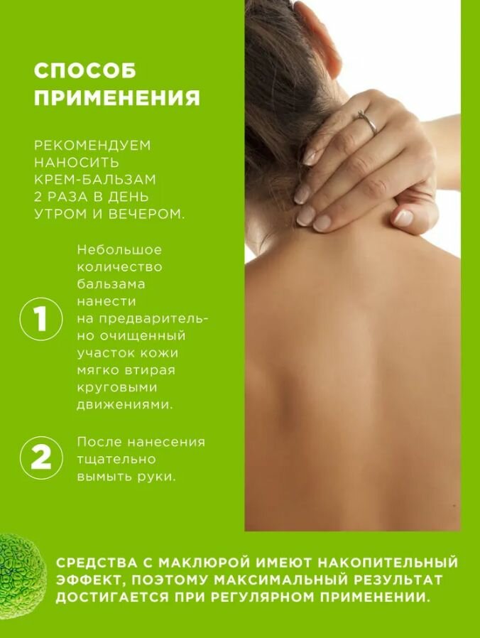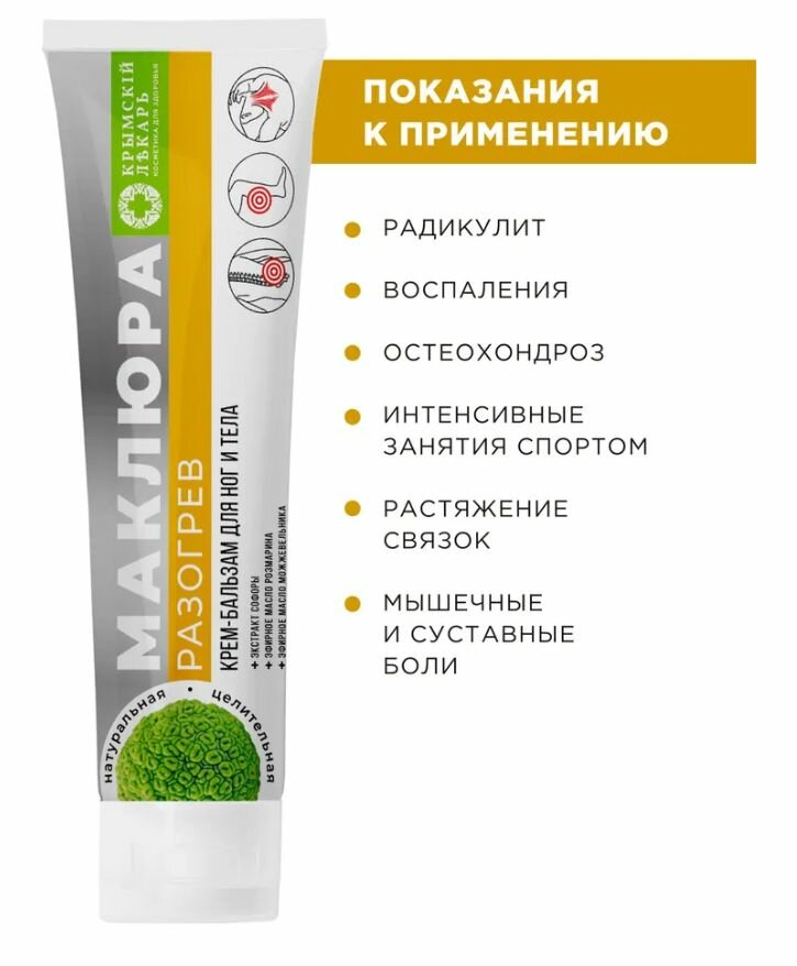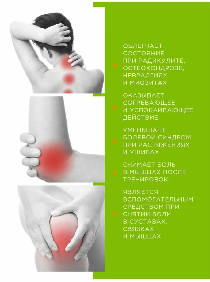 Рекомендован для облегчения состояния при радикулите, остеохондрозе, невралгиях и миозитах. Экстракт софоры снимает отечность, улучшает кровообращение. Экстракт маклюры обладает болеутоляющим и противовоспалительным свойствами. Эфирные масла розмарина, гвоздики, можжевельника, эвкалипта оказывают разогревающее и успокаивающее действие.