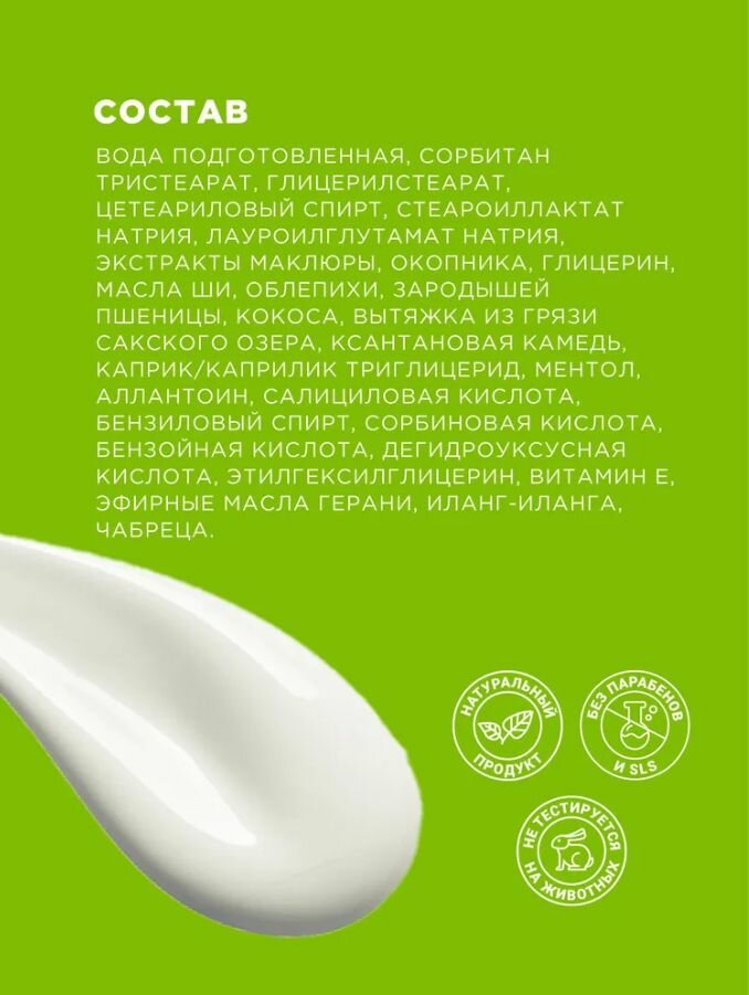 | Состав | вода подготовленная, сорбитан тристеарат, глицерилстеарат, цетеариловый спирт, стеароиллактат натрия, лауроилглутамат натрия, экстракты маклюры, шиповника, конского каштана, глицерин, масла ши, миндаля, виноградных косточек, кокоса, расторопши, масляный экстракт хвои, ксантановая камедь, каприк/каприлик триглицерид, аллантоин, бензиловый спирт, сорбиновая кислота, бензойная кислота, дегидроуксусная кислота, этилгексилглицерин, витамин Е, эфирные масла сосны и лимона |