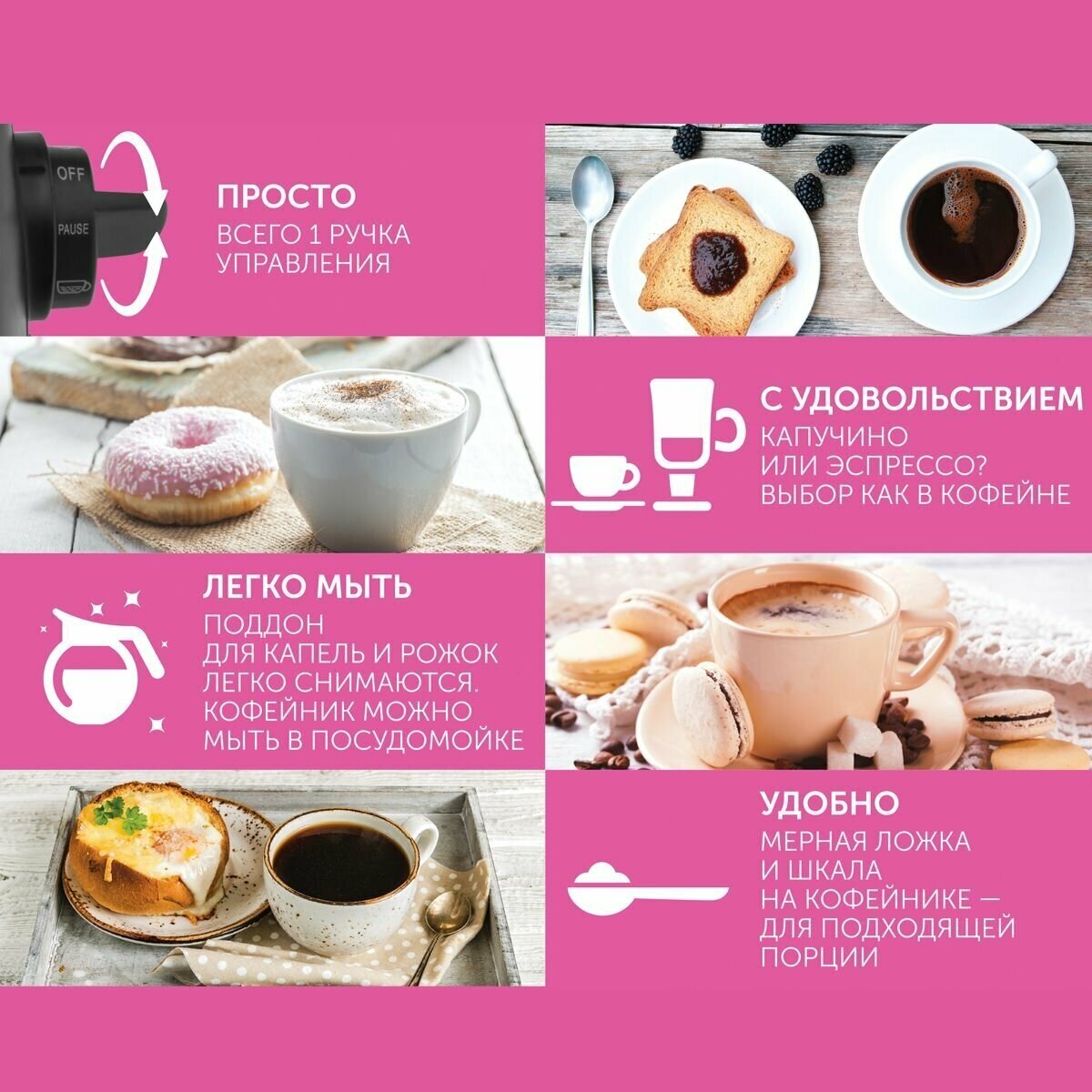 Вместимость резервуара для воды позволяет приготовить кофе на несколько гостей одновременно, объем конечного продукта составляет 240 мл. Для начала работы следует насыпать молотый кофе в предусмотренный контейнер, а мерная ложечка не позволит ошибиться с нужным количеством.
