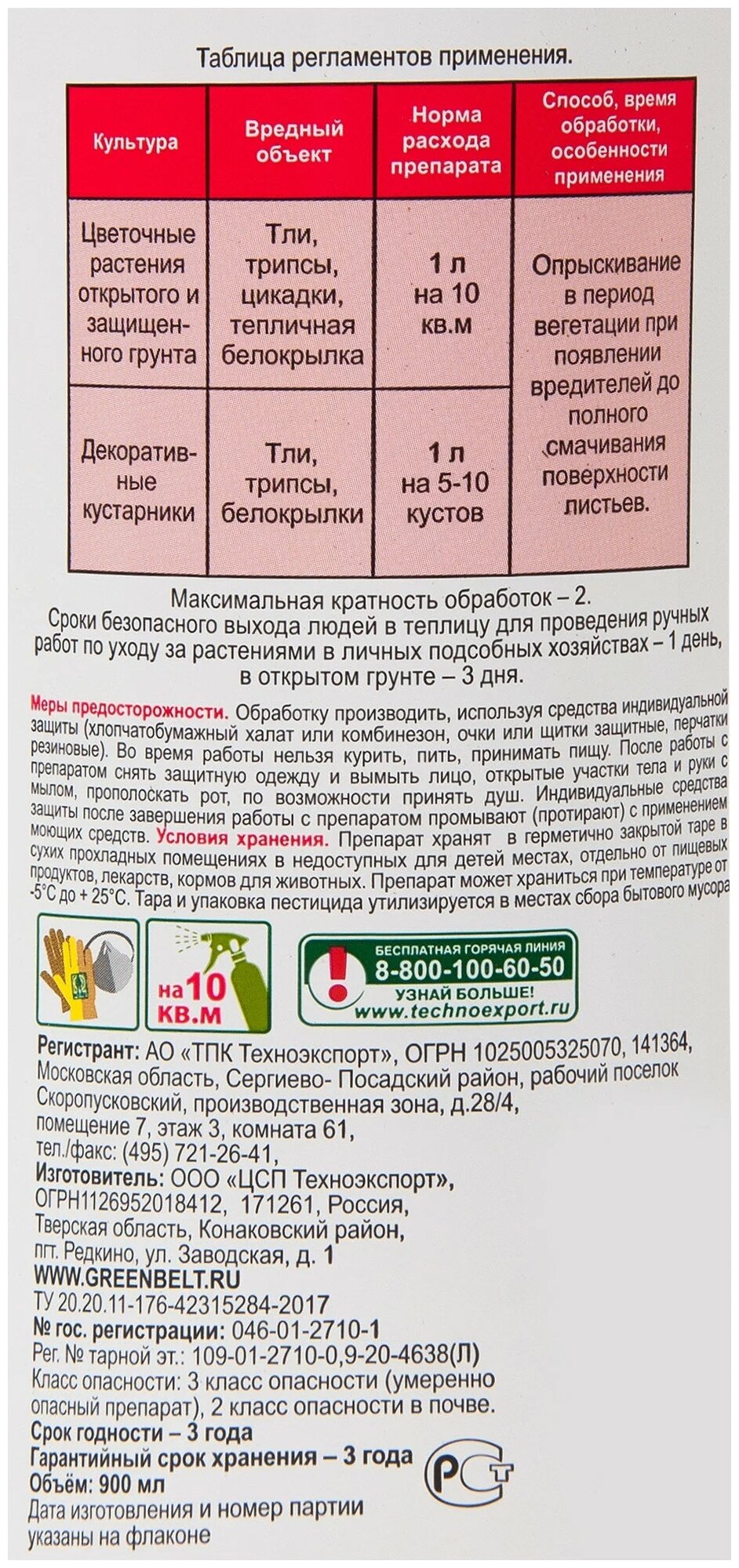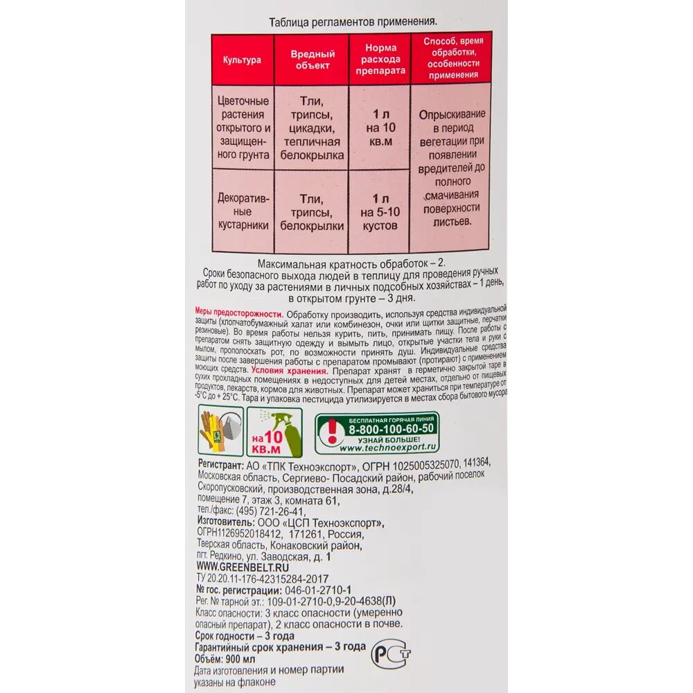 | Назначение (животные, насекомые-вредители, болезни и др.) | Тля, белокрылка, колорадский жук |