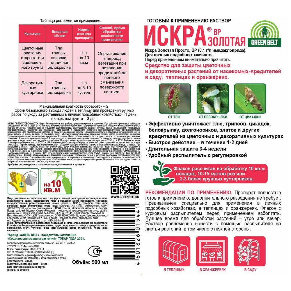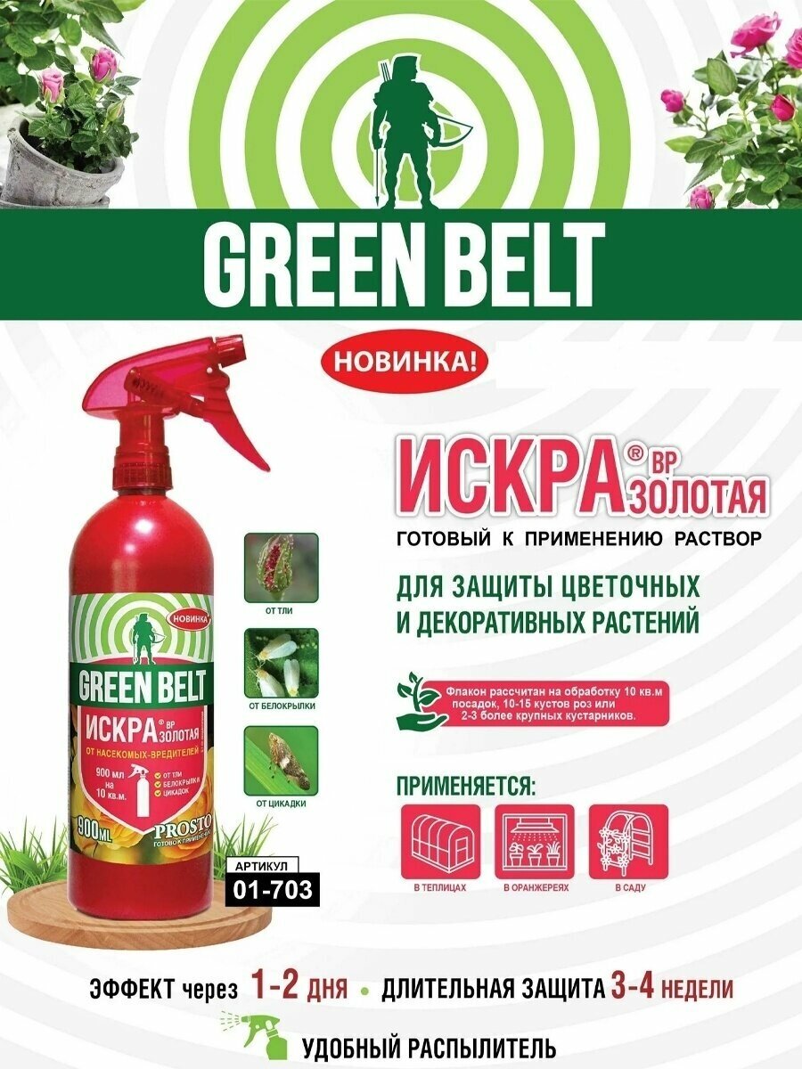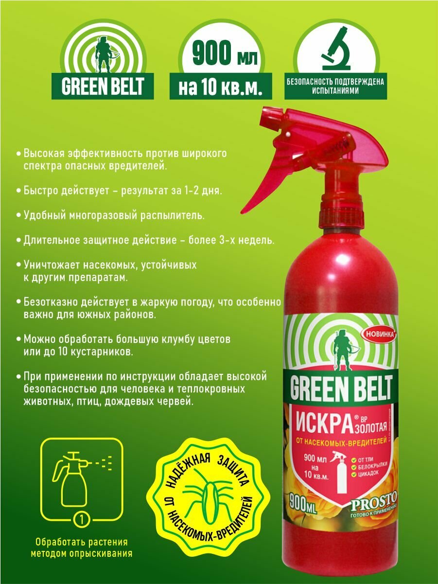 GREEN BELT Искра Золотая - инсектицид эффективно уничтожающий тлю, белокрылку, трипсов, цикадок и прочих насекомых-вредителей, стойких к другим препаратам. Средство применяется в открытом и защищенном грунте на цветах и декоративных кустарниках.