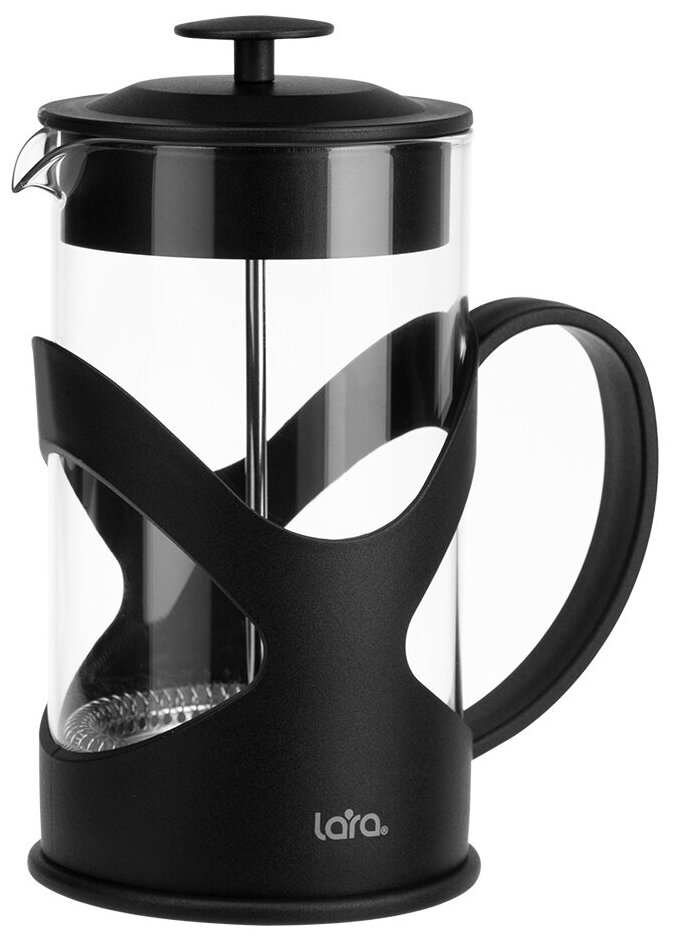 Практичный и стильный дизайн френч-пресса Lara LR06-56 порадует за чаепитием не только вас, но и ваших гостей. Френч-пресс выполнен из экологически чистых материалов. Колба сделана из жаропрочного боросиликатного стекла абсолютно безопасного для пищевых продуктов. Она заключена в стильный черный корпус и имеет ручку, за которую удобно держать френч-пресс. Оригинальный внешний вид изделия украсит интерьер современной кухни. Форма носика идеальна для наливания напитков и препятствует образованию подтеков. Пресс-фильтр из нержавеющей стали с уплотнительным кольцом. Благодаря прозрачным стенкам вы сможете определить крепость заваренного напитка. Кроме того, данная модель оснащена ненагревающейся ручкой, что обеспечивает удобство и безопасность использования. Модель представлена в нескольких объемах: 350, 600, 800, 1000 мл. Френч-пресс упакован в подарочную коробку.