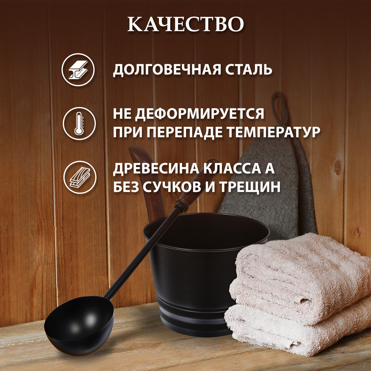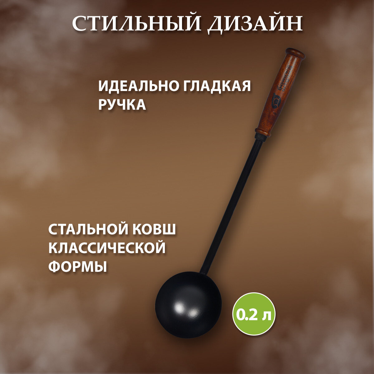 Ковш Банные Штучки – незаменимый атрибут для похода в баню или сауну. Используется для обливаний и для добавления воды или отвара трав на раскаленные камни. Изготовлен из нержавеющей стали, обладающей антикоррозийными свойствами. Оснащен удобной длиной ручкой с деревянным наконечником, предохраняющей руки от ожогов паром.
