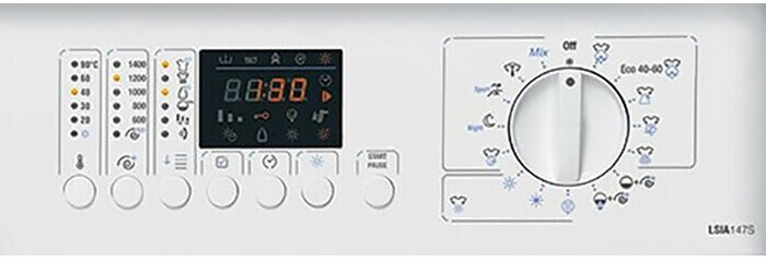 | Дисплей | Индикация оставшегося времени, Отсрочка старта, Рекомендованная загрузка, Индикация хода программы, Регулировка скорости отжима, Регулировка температуры |