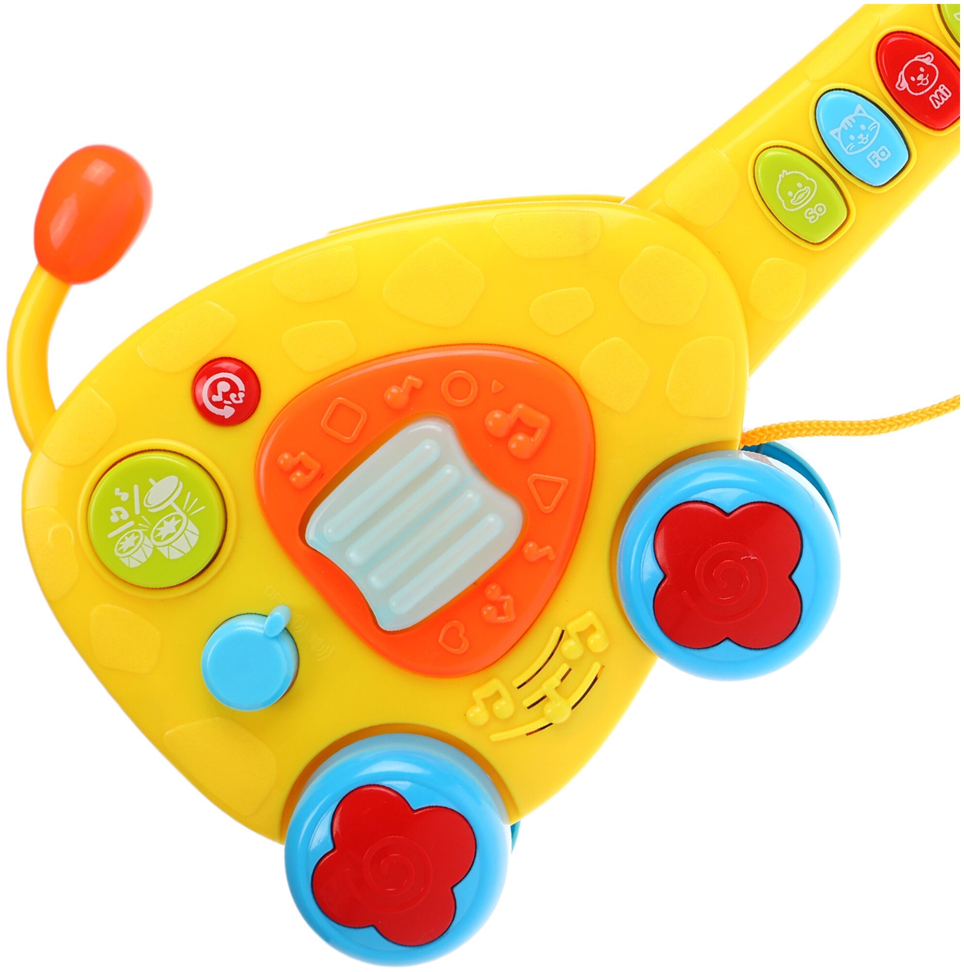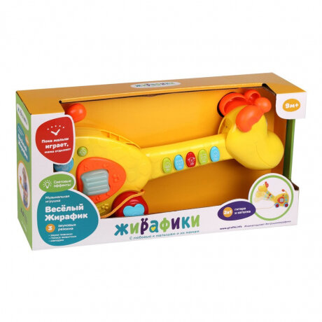 «пианино» маленький гитарист сможет придумать и сыграть свою собственную мелодию, нажимая на клавиши. Как здорово! А если потянуть шею жирафика вверх, он превратится в забавную каталку на верёвочке.