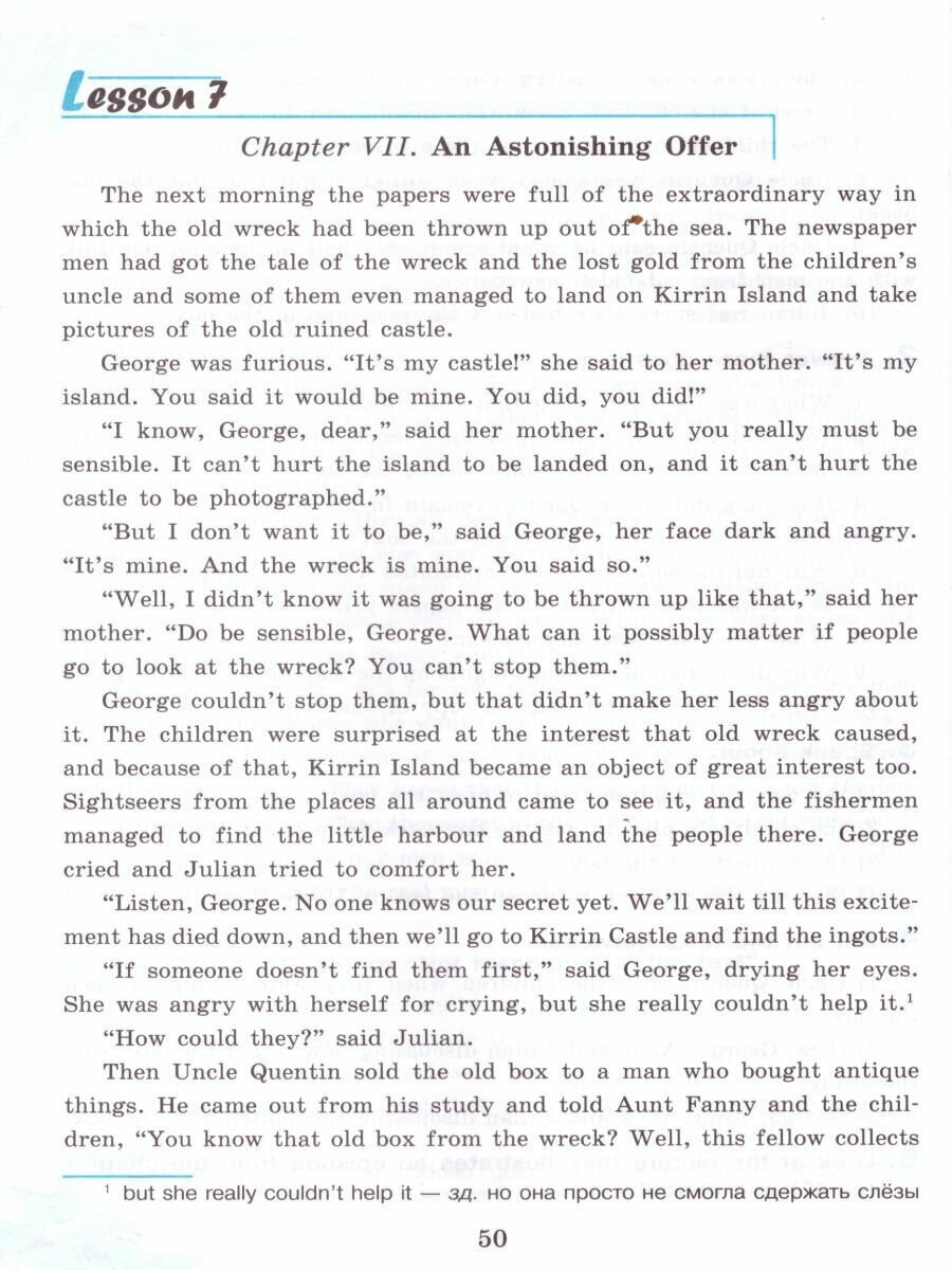 Английский язык 7 класс Книга для чтения Афанасьева О. В, Баранова К. М, Михеева И. В.Афанасьева Английский язык 7 класс Книга для чтения является частью учебно-методического комплекта по английскому языку для 7 класса общеобразовательных организаций и школ с углубленным изучением английского языка. Книга состоит из двух частей. Первая часть - повесть известной английской писательницы Инид Блайтон «Великолепная пятерка на острове сокровищ». Вторая часть предназначена для чтения на отдыхе, во время каникул или в свободное время дома. В неё вошли тексты об интересных людях и фактах.