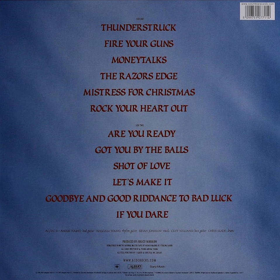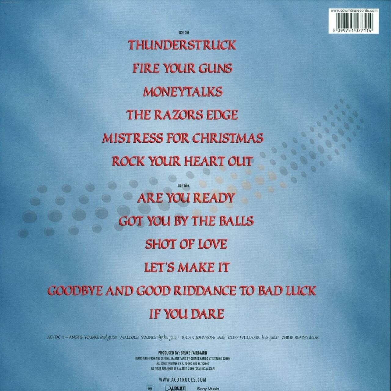 Единственный студийный альбом группы , в записи которого участвовал ударник Крис Слейд. Альбом включает в себя песни Thunderstruck и Moneytalks , одни из самых известных треков AC DC. Огромный коммерческий успех вернул группе известность конца 70-х — начала 80-х годов. Альбом находится на 2 месте по рейтингу Billboard 200 в США и на 4 месте — в Великобритании . The Razor’s Edge был пятикратно сертифицирован как платиновый альбом (продано 5 миллионов копий)Достоинства: