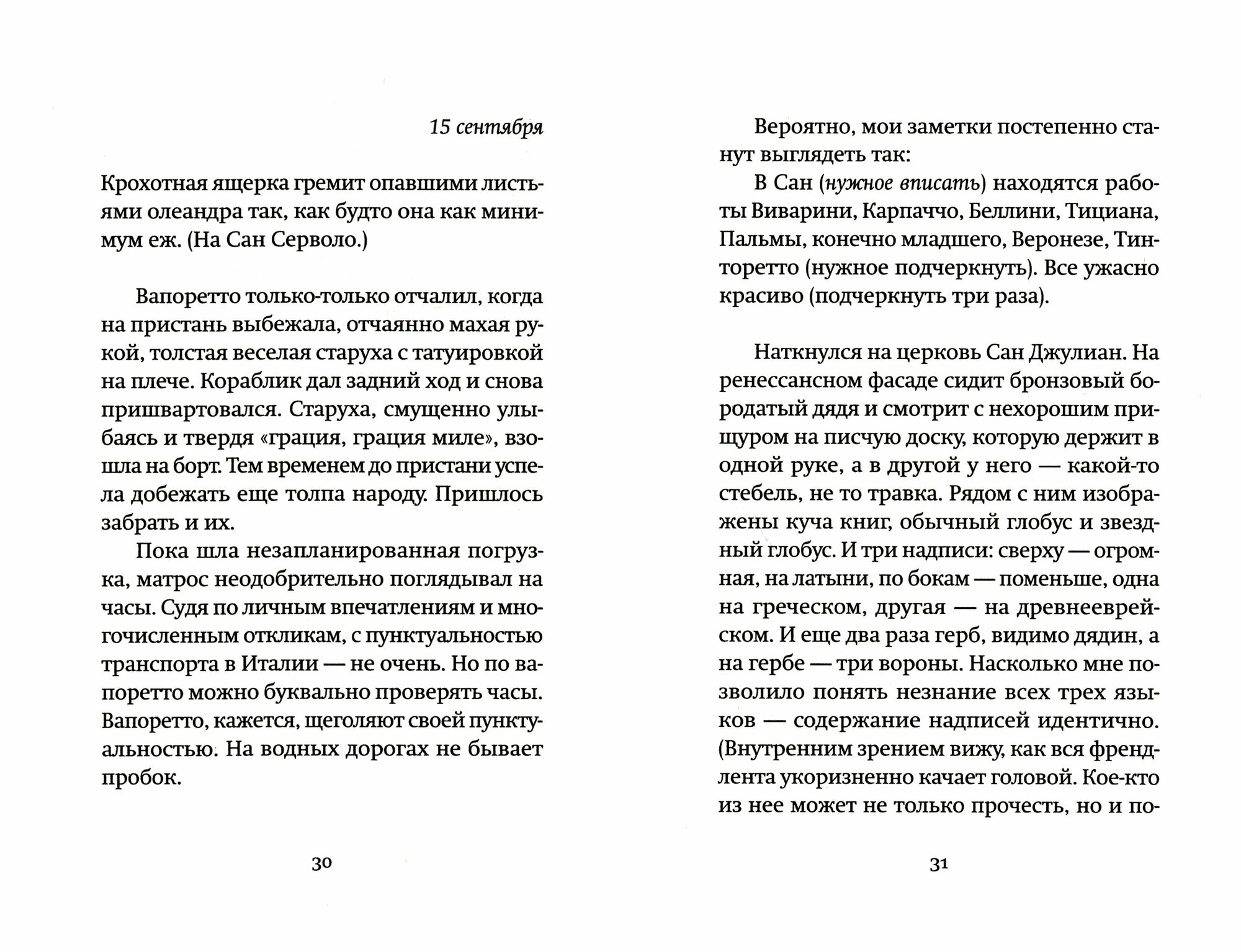 Название книги сразу говорит, что она не о Венеции, а «из Венеции». То есть, книга ни в коем случае не путеводитель или справочник. С её помощью Вы не найдете в ней пути домой, заблудившись среди каналетто, кампо и корте, или адресов как бюджетных, так и мишленовских «точек общепита» (исключая три, действительно хорошие, бодеги). Не увидим и подсказок, как найти большинство мест, где находятся те, или иные шедевры, чем они знамениты, и хотя бы их названий. Обидно, потому что, если автор рассказывает о них, то делает это очень вкусно. Формат книги также не предусматривает фотографий, или рисунков этих шедевров. Так надо ли читать эту книгу?