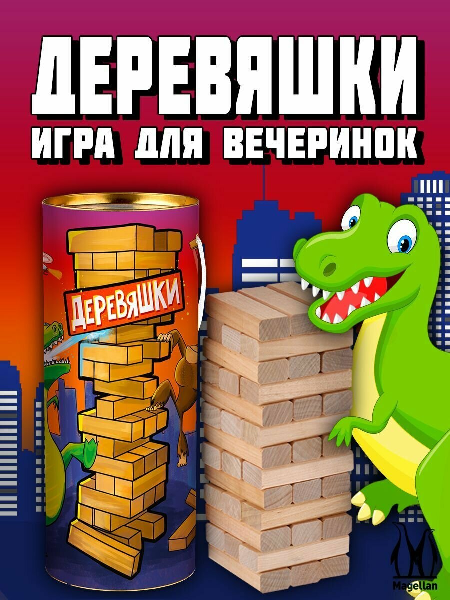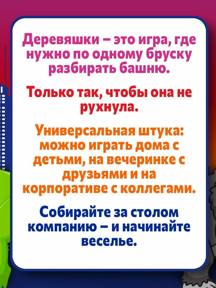 Деревяшки - это игра, где нужно по одному бруску разбирать башню. Только так, чтобы она не рухнула. Универсальная штука: можно играть дома с детьми, на вечеринке с друзьями и на корпоративе с коллегами. Собирайте за столом компанию - и начинается веселье.