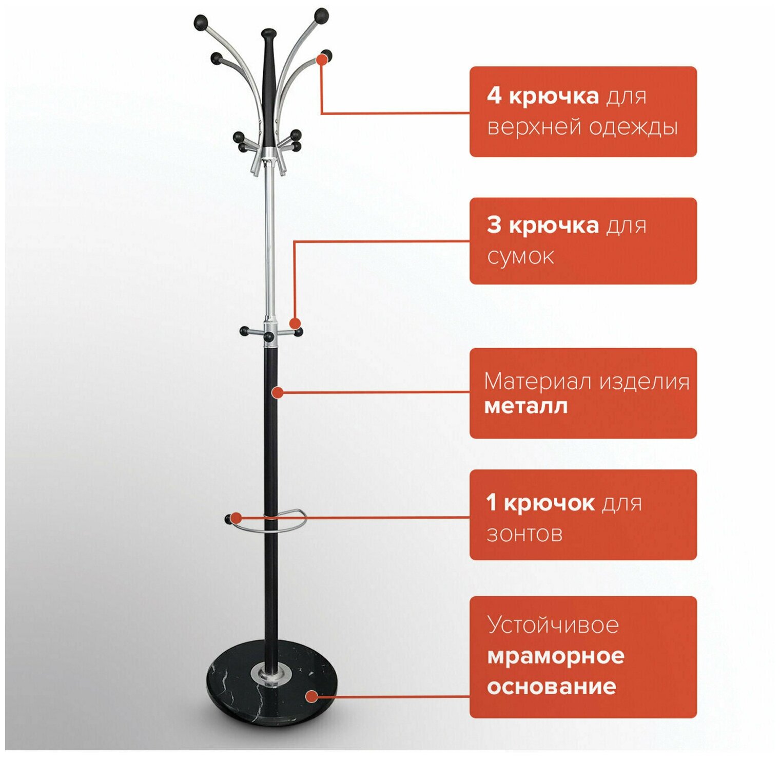 | Прочие особенности и свойства | Напольная вешалка-стойка BRABIX "CR-848" с прочными металлическими крючками для верхней одежды и головных уборов и стойкой для зонтов - функциональное решение для хранения вещей в офисе и дома.,,Оснащена пятью прочными металлическими крючками для головных уборов и верхней одежды, способных выдержать общую нагрузку до 10 кг.,,Бесспорное преимущество данной модели - основание из натурального мрамора, которое не только делает дизайн каждой вешалки особенным, но обеспечивает высококлассную устойчивость.,,Дополнительно вешалка-стойка BRABIX CR-848 оснащена крючком для зонтов.,,Комплект поставляется в разобранном виде. Размер - 1800х370х370 мм. |