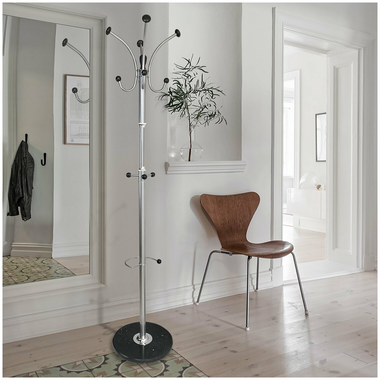 Напольная вешалка-стойка BRABIX "CR-855" с прочными металлическими крючками для верхней одежды и головных уборов и стойкой для зонтов - функциональное решение для хранения вещей в офисе и дома.Оснащена четырьмя прочными металлическими крючками для головных уборов и верхней одежды, способных выдержать общую нагрузку до 10 кг. Также есть три дополнительных крючка для сумок. Бесспорное преимущество данной модели - основание из натурального мрамора, которое не только делает дизайн каждой вешалки особенным, но обеспечивает высококлассную устойчивость. Дополнительно вешалка-стойка оснащена крючком для зонтов. Комплект поставляется в разобранном виде. Размер - 1870х370х370 мм. Приобрести вешалку-стойку BRABIX "CR-855" можно в нашем интернет-магазине. Удачных покупок!
