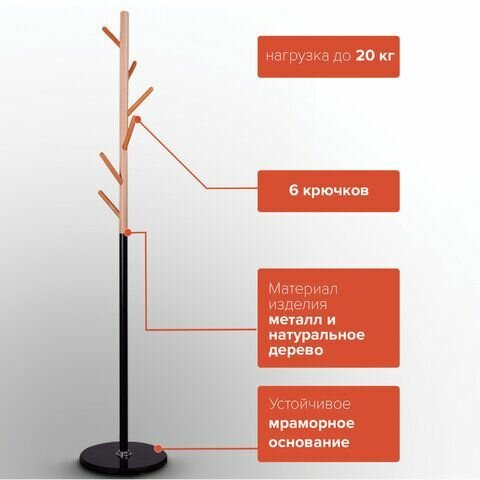 Современная вешалка BRABIX CR-1906 привлекает внимание не только своим оригинальным дизайном, но и качественными материалами. Сочетание натурального бука, мрамора и металла подойдет для дома, офиса и других общественных учреждений.Верхняя часть вешалки-стойки выполнена из натурального бука, 6 крючков расположены "по спирали", что позволяет компактно разместить верхнюю одежду. Максимальная нагрузка на вешалку - 20 кг. Устойчивость данной модели обеспечивает основание из натурального мрамора.