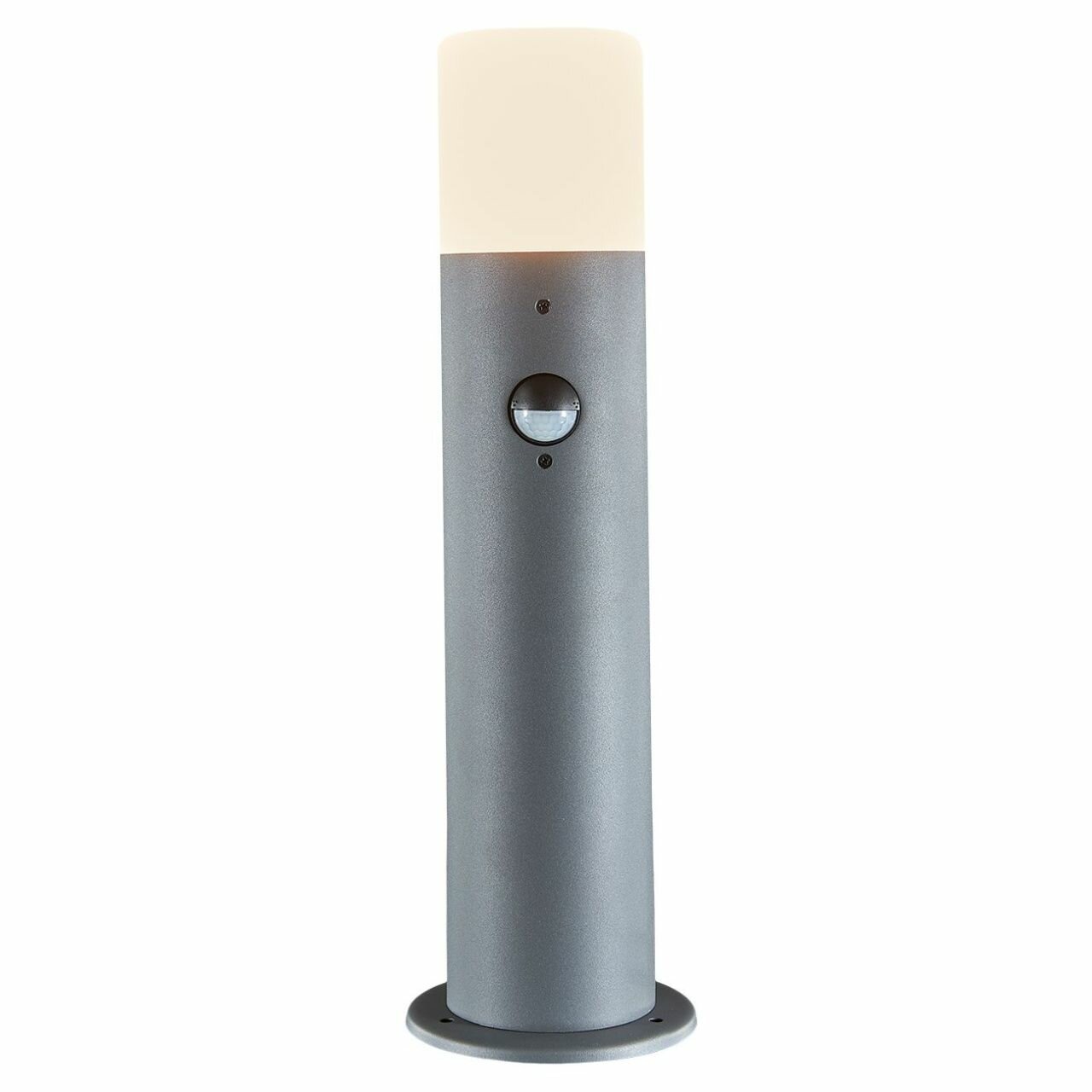 Стильный светильник выполнен в форме небольшого цилиндрического столбика с антрацитовым корпусом и матовым белым рассеивателем. Прибор монтируется на горизонтальное основание накладным способом. Встроенный датчик движения позволяет экономно расходовать электроэнергию, используя уличное освещение только в случае необходимости.