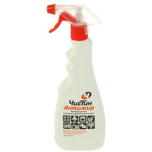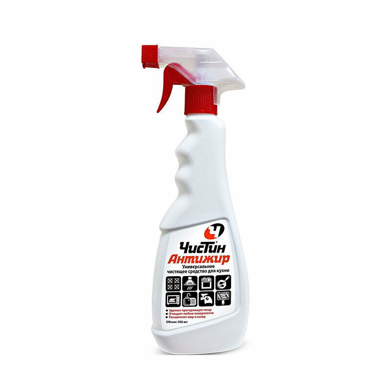 Универсальное чистящее средство в формате спрея Чистин Антижир для эффективного обезжиривания, удаления нагара и стойких загрязнений на всех видах кухонных плит, духовок и вытяжек. Рекомендован для ежедневного применения.