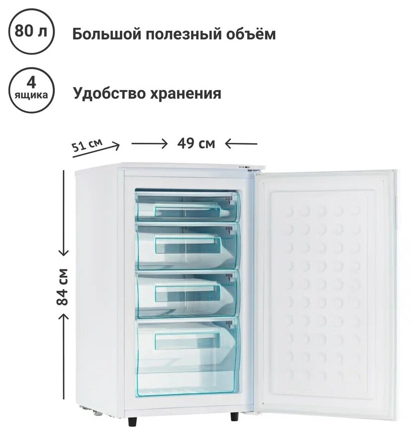 Морозильный шкаф Tesler легко справится с глубокой заморозкой продуктов, тем самым поможет заготовить запасы провианта и сохранить их максимально долго. 80 литров полезного объема морозилки подойдет для того, чтобы заморозить продукты на целую семью. Для удобства расположения продуктов для заморозки и последующего извлечения в Tesler предусмотрено разделение на 4 секции. Гарантированное сохранение температуры внутри устройства после отключения от электросети 10 часов. Это не значит, что спустя указанное время с Вашими продуктами, что-то произойдет, ведь для полной разморозки понадобится более 48 часов. Расход электричества в 219 кВт?ч в год (класс А).