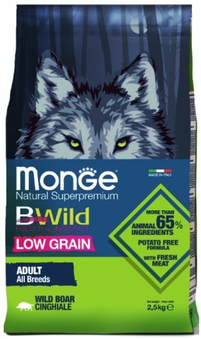 Monge Dog BWild Low Grain низкозерновой корм из мяса дикого кабана для взрослых собак всех пород - полнорационный сбалансированный корм из мяса дикого кабана для собак всех пород. Рацион разработан с высоким содержанием белка и с ограниченным количеством злаков, не содержит картофель.