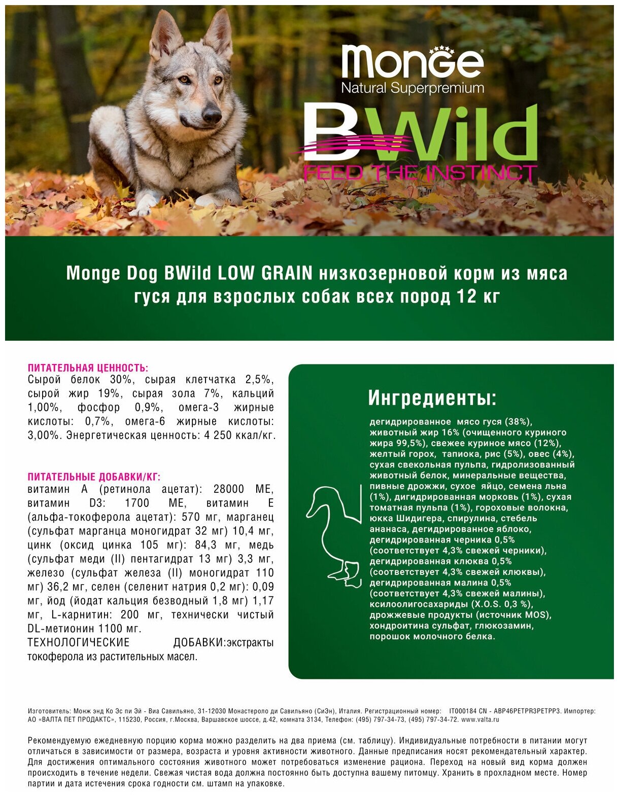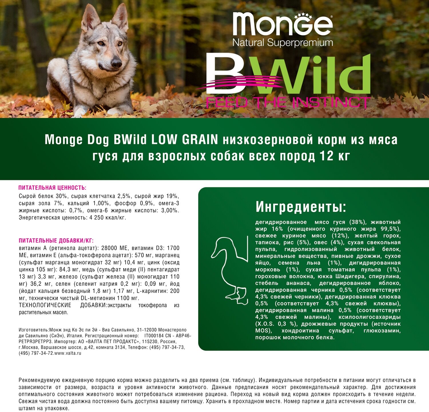 Корм Monge Dog BWild Low Grain низкозерновой для взрослых собак всех пород из мяса гуся 12кг Unknown (70011778)