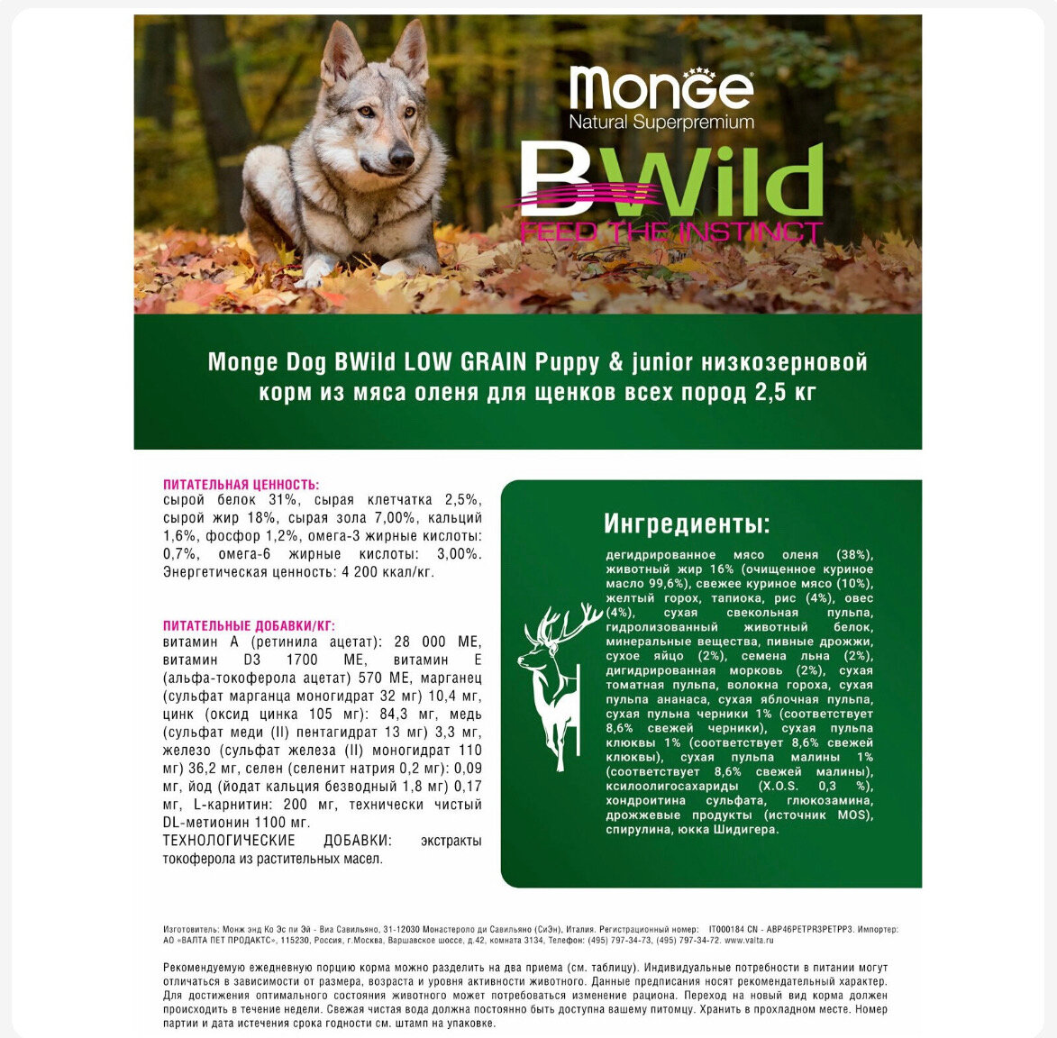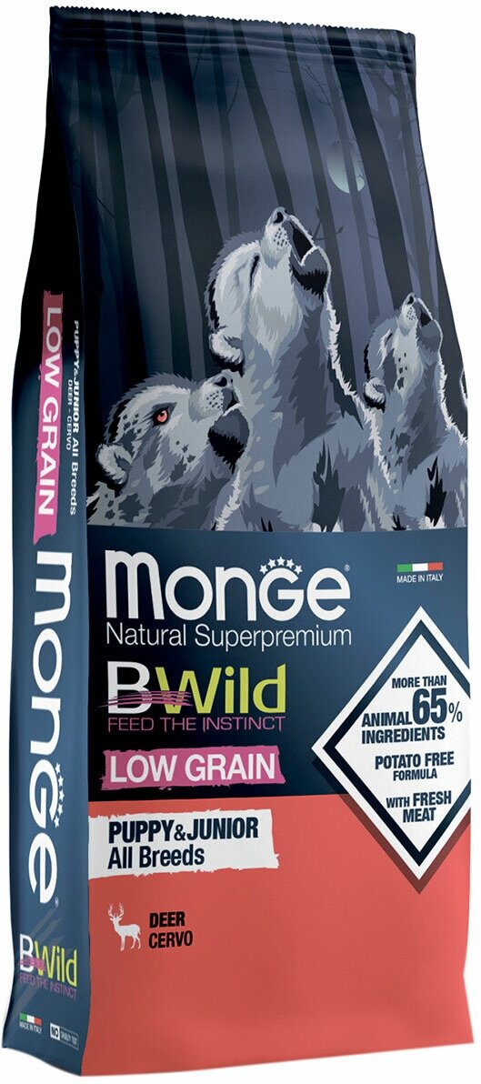 Monge Dog BWild Low Grain Puppy & junior низкозерновой корм из мяса оленя для щенков всех пород - полноценный сбалансированный корм из мяса оленя для щенков всех пород. Рацион разработан с высоким содержанием белка и с ограниченным количеством злаков, не содержит картофель.
