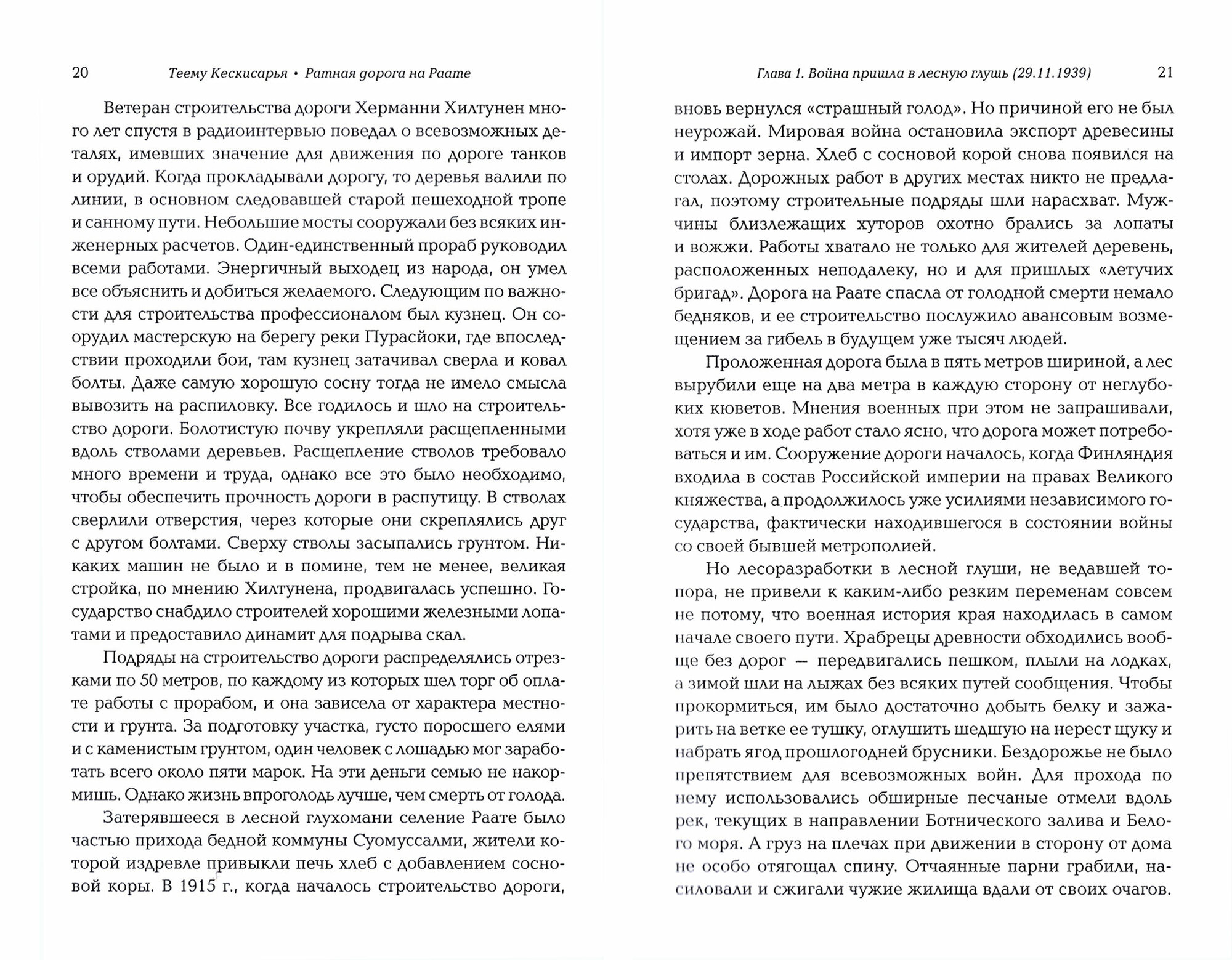 Книга финского историка Т. Кескисарья посвящена одному из самых драматических событий Советско-финляндской войны (Зимней войны) 1939–1940 гг. – боям в районе села Суомуссалми и дороги на Раате. Здесь две хорошо вооруженные советские дивизии (44-я и 163-я), выполняя приказ командования рассечь территорию Финляндии от карельской границы на востоке до Ботнического залива на западе, были остановлены и разгромлены меньшими по численности, но лучше приспособленными к военным действиям в заснеженной тайге финскими частями. Автор подчеркивает, что его главной целью было не описание военных действий, а изучение судеб, настроений и душевного состояния людей – военных и гражданских, оказавшихся вовлеченных в эту драму, как с финской, так и с советской стороны. Он детально описывает трудную жизнь в этом глухом уголке Финляндии, рассказывает о предшествующих Зимней войне событиях, в том числе периода гражданской войны в Финляндии и России. В книге показана сложная картина политических настроений в финской глубинке в предвоенные годы. Автор далек от торжества по поводу победы финнов в этих боях, он приходит к выводу, что в Зимней войне проиграли обе стороны, и это стало главным уроком для двух народов-соседей, который они все- таки смогли для себя извлечь.