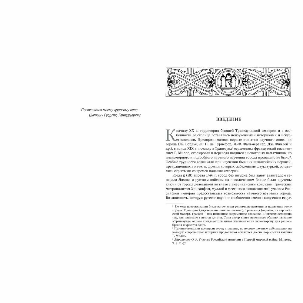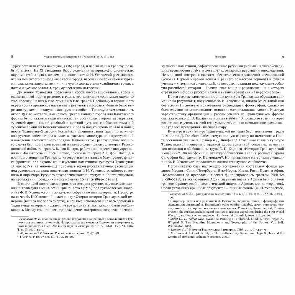 Монография посвящена русским научным экспедициям в Трапезунд (1916, 1917 гг.) под руководством академика-византиниста Ф. И. Успенского. Материалы экспедиции о культуре и архитектуре Трапезунда были опубликованы лишь частично. Настоящей книгой удается восполнить лакуны и представить новые данные по истории культуры Трапезундской империи мировой византинистики.