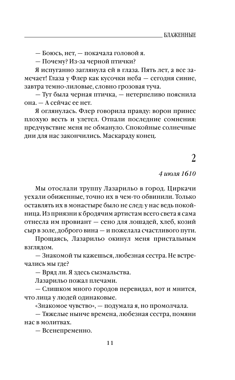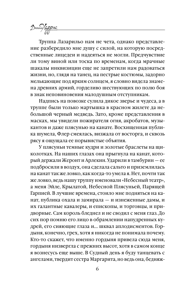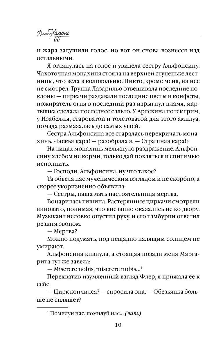 Книга в фирменном стиле Джоанн Харрис - очень увлекательный, динамичный и оригинальный сюжет. Но перевод, увы, не на "5" - переводчика буквально заклинило на церковно-славянском "аки" и к месту и, чаще всего, не к месту. Плюс ляпы вроде корявой кальки с английского "вимпл" вместо апостольника или уж на худой конец платка, а ведь догадаться, о чем идет речь совсем несложно, учитывая, что действие разворачивается в женском монастыре, ну или хотя бы не полениться и заглянуть в словарь. Возможно, кому-то это покажется мелочью, но на мой читательский взгляд, качество перевода это половина успеха книги - небрежный, стилистически не выверенный перевод, как минимум, разрушает атмосферу произведения. В данном случае перевод в целом неплох, но на подобных огрехах постоянно спотыкаешься, мысленно перестраивая фразы.