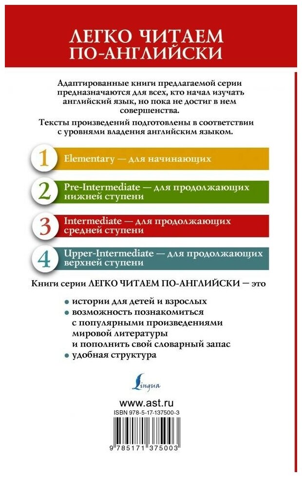 Недавно я прочитала книгу "Унесенные ветром" Маргарет Митчел в русском переводе, и она мне невероятно понравилась, поэтому решила взять данную книгу на английском в адаптации. Подойдет для чтения тем, кто имеет средний уровень английского (Intermidiate). В книге также достаточно много новых интересных слов, которые тут же запоминаются, т.к. учить новые слова в контексте удобнее и проще.