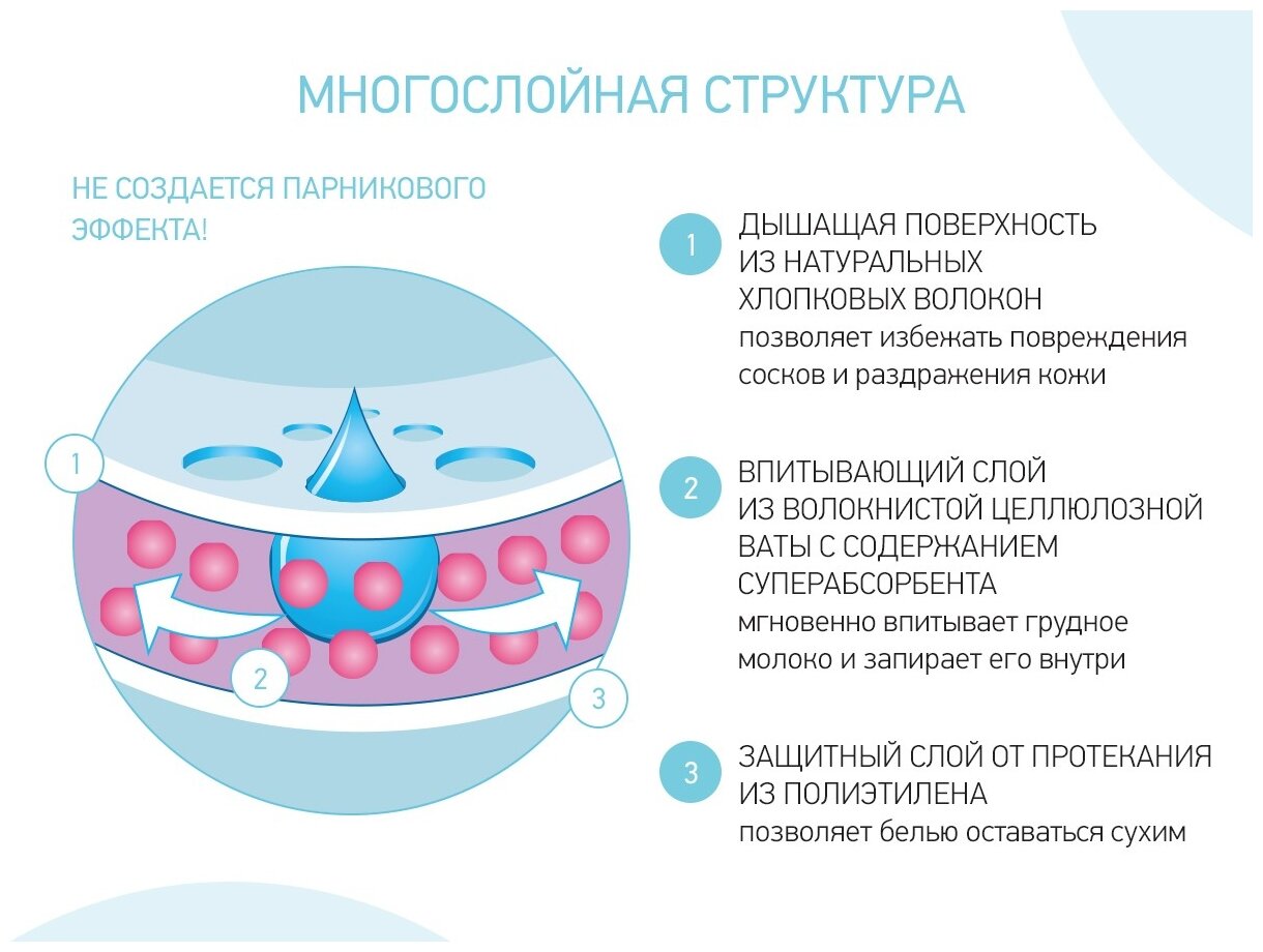 Впитывающие прокладки для груди – незаменимый предмет личной гигиены для молодой мамы. Прокладки удобно крепятся к бюстгальтеру с помощью двойного клейкого слоя, 3D-форма обеспечивает плотное прилегания к груди, а мягкая текстура прокладок не раздражает кожу. Современный японский суперабсорбент отлично впитывает жидкость и оставляет поверхность груди сухой. Внешняя поверхность препятствует попаданию влаги на одежду и при этом позволяет коже дышать.Характеристики:Внутренний впитывающий слой – волокнистая целлюлозная вата с содержанием SAP (суперабсорбента). Жидкость мгновенно впитывается, поверхность кожи остается сухой.Поверхность внутренней стороны прокладки – из натуральных хлопковых волокон. Дышащая поверхность и мягкость ткани препятствует повреждению сосков и раздражению кожи.Индивидуальная упаковка каждой прокладки обеспечивает должный уровень гигиены и комфорта.Защитный слой на внешней стороне прокладки обеспечивает защиту от протекания и при этом дает коже дышать.Меры предосторожности:Прокладки меняйте регулярно после каждого кормления.Храните в местах, недоступных детям.В случае появления аллергической реакции прекратите использование и обратитесь к врачу.