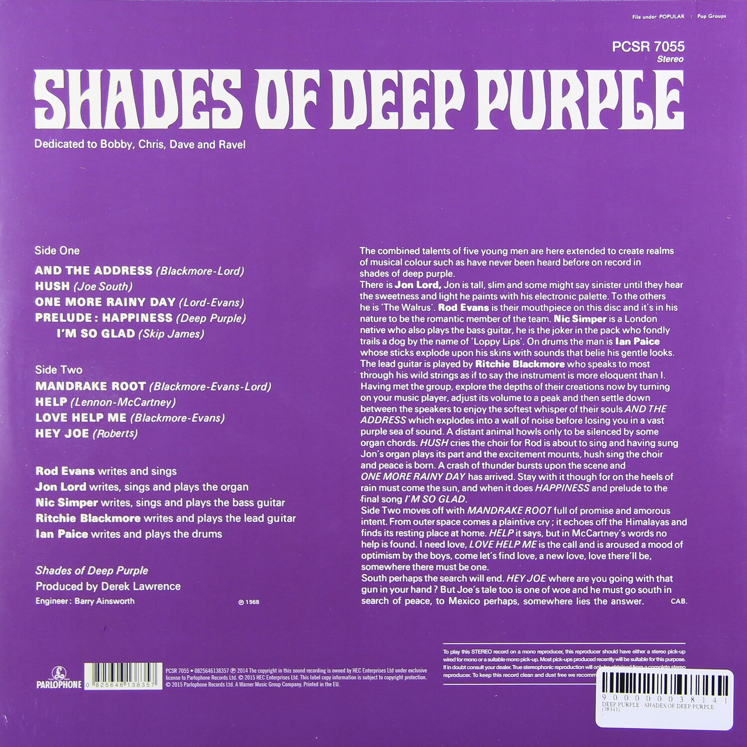 Список композиций:A1 And The Address A2 Hush A3 One More Rainy Day A4a Prelude: Happiness A4b I'm So Glad B1 Mandrake Root B2 Help B3 Love Help Me B4 Hey Joe Компании и т. п. Phonographic Copyright (p) – HEC Enterprises Ltd. Copyright (c) – HEC Enterprises Ltd. Copyright (c) – Parlophone Records Ltd. Licensed To – Parlophone Records Ltd. Pressed By – Optimal Media GmbH – BF87120 Published By – Hec Music Published By – Lowery Music Published By – Chappell Published By – Essex Music Published By – Northern Songs Published By – Carlin Music Corp. Над релизом работали Drums – Ian Paice Engineer – Barry Ainsworth Lead Guitar – Ritchie Blackmore Producer – Derek Lawrence Vocals – Rod Evans Vocals, Bass Guitar – Nic Simper Vocals, Organ – Jon Lord
