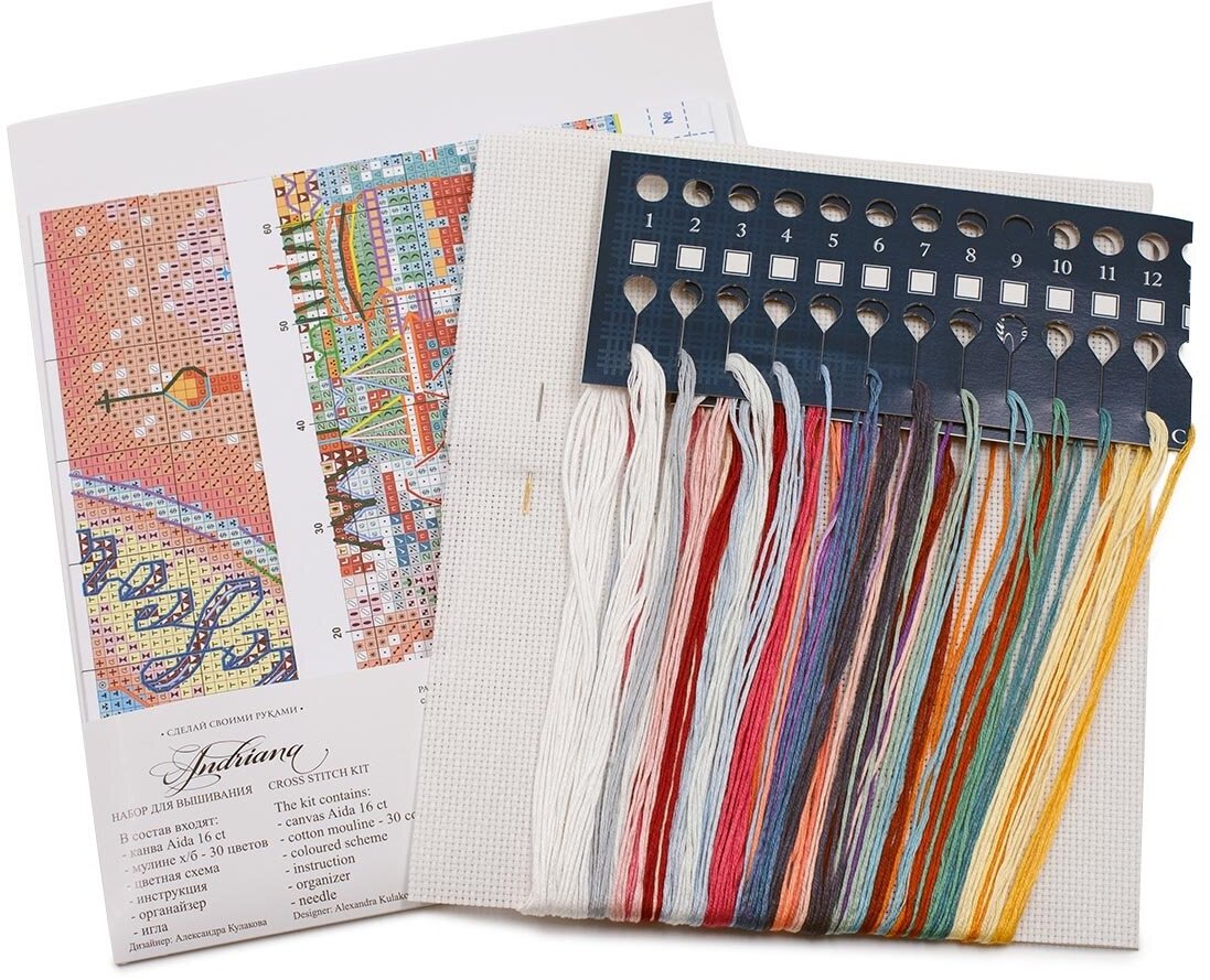 | В набор входит | канва Aida 16 ct белого цвета, хлопковое мулине (30 цв.), разобранное на органайзере, игла с позолоченным ушком, цветная символьная схема, инструкция по вышиванию. |