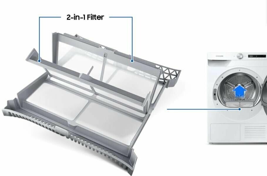Samsung обладает экономичностью в плане энергопотребления, поддерживая энергоэффективность уровня А+. Такой рейтинг энергоэффективности обусловлен применением хладагента и рециркуляции горячих потоков воздуха для нагревания воздуха внутри камеры. Реверсивная дверь позволит открывать камеру в более удобном направлении в зависимости ото того, как вы расположите сушильную машину.