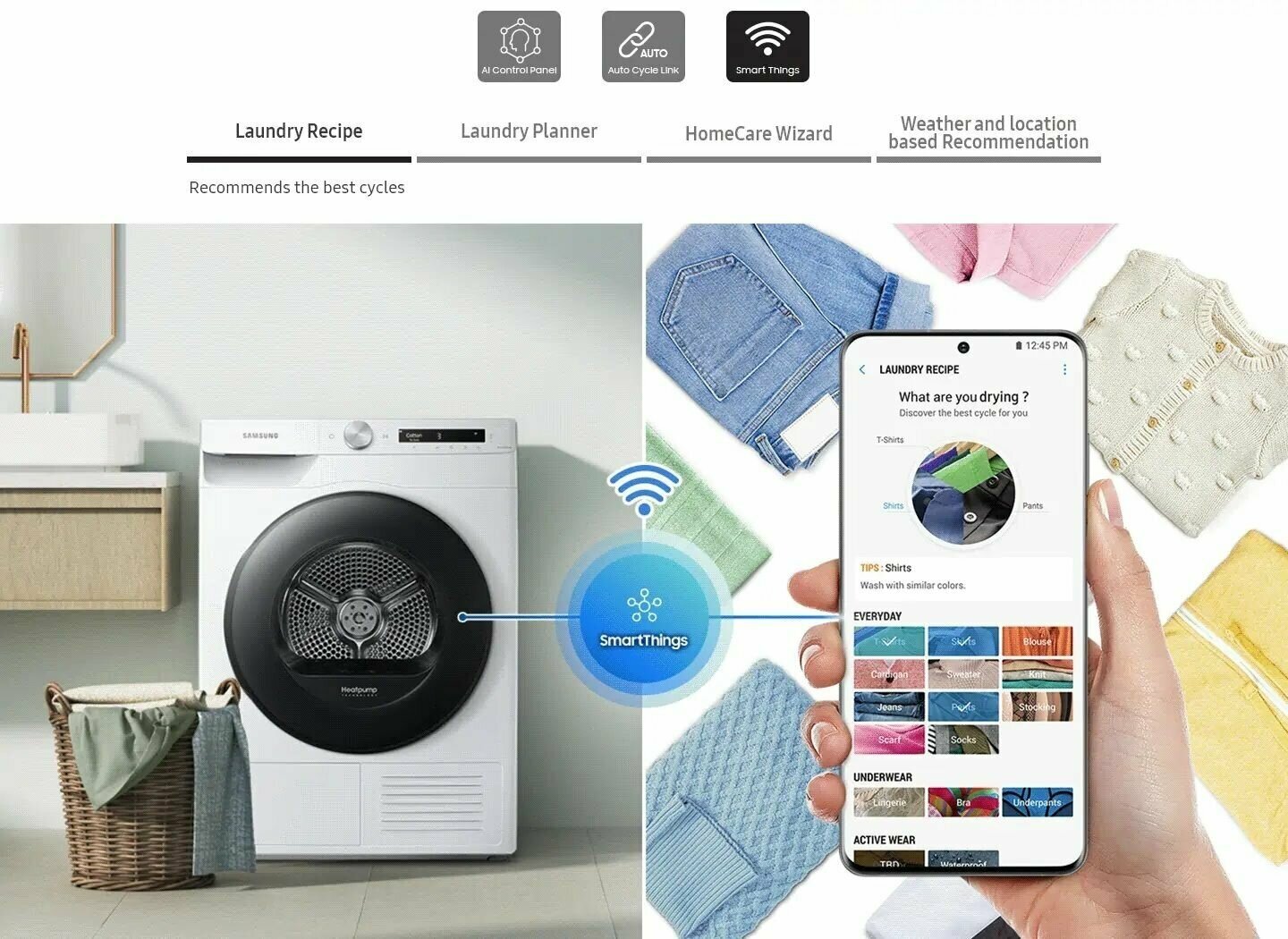 -"Киллер фича" SmartThings. Возможность выбирать и запускать режимы через смартфон. У нее есть WiFi!!! Жена в первые дни боялась самостоятельно запускать, просила помощи когда я был на работе. Все успешно запускалось со смартфона), ну и синхронизация со всей новой техникой от Самсунг. Даже уведомления приходят на телевизор и часы о том, что вещи готовы) Если в доме есть стиральная машина этого бренда со SmartThings , то оба устройства синхронизируются и подсказывают режимы, которые подходят для вашего типа белья.