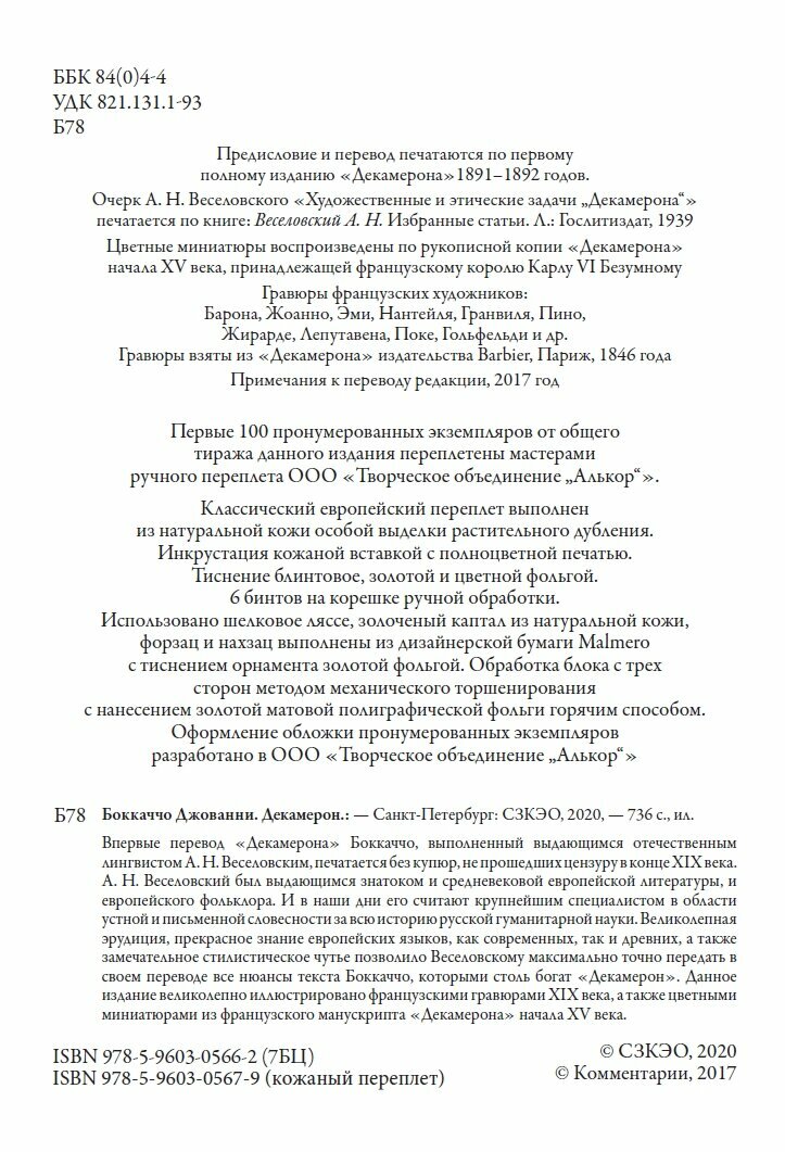 Первое издание его перевода появилось в 1891-1892 гг. Текст был напечатан в двух вариантах; 1000 экземпляров содержали пропуски мест, не допущенных цензурой, и лишь 100 книг были напечатаны без купюр. Примечательно, что издания советского времени, как и публикации "Декамерона", появившиеся уже в XXI веке, также были неполными. Данная публикация лишена этого недостатка. Впервые за более чем вековую историю отечественных изданий знаменитого произведения Боккаччо, читатели могут познакомиться с полным переводом "Декамерона" без каких-либо сокращений.